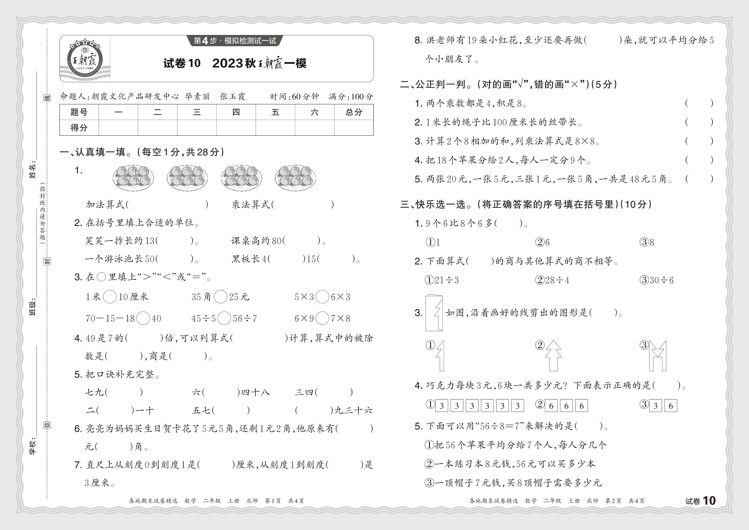 2023秋上册二年级数学北师版 王朝霞一模JX