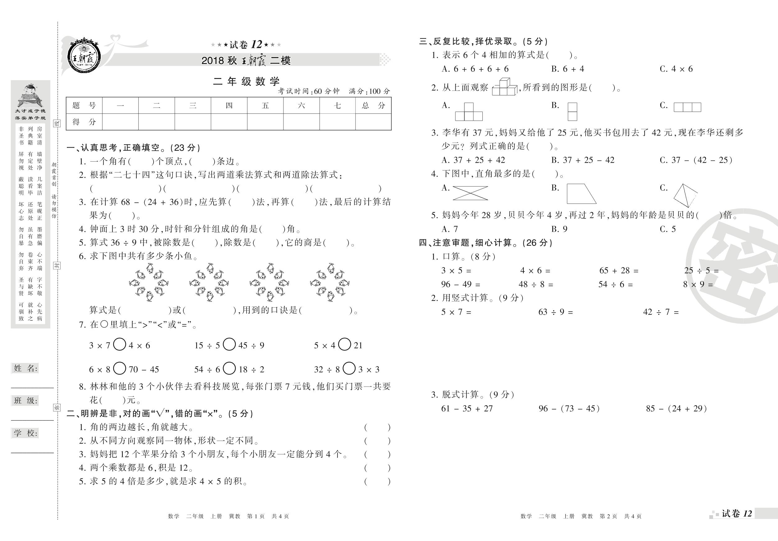 王朝霞期末模拟卷二年级上册数学(冀教版)_R210803104612【12】