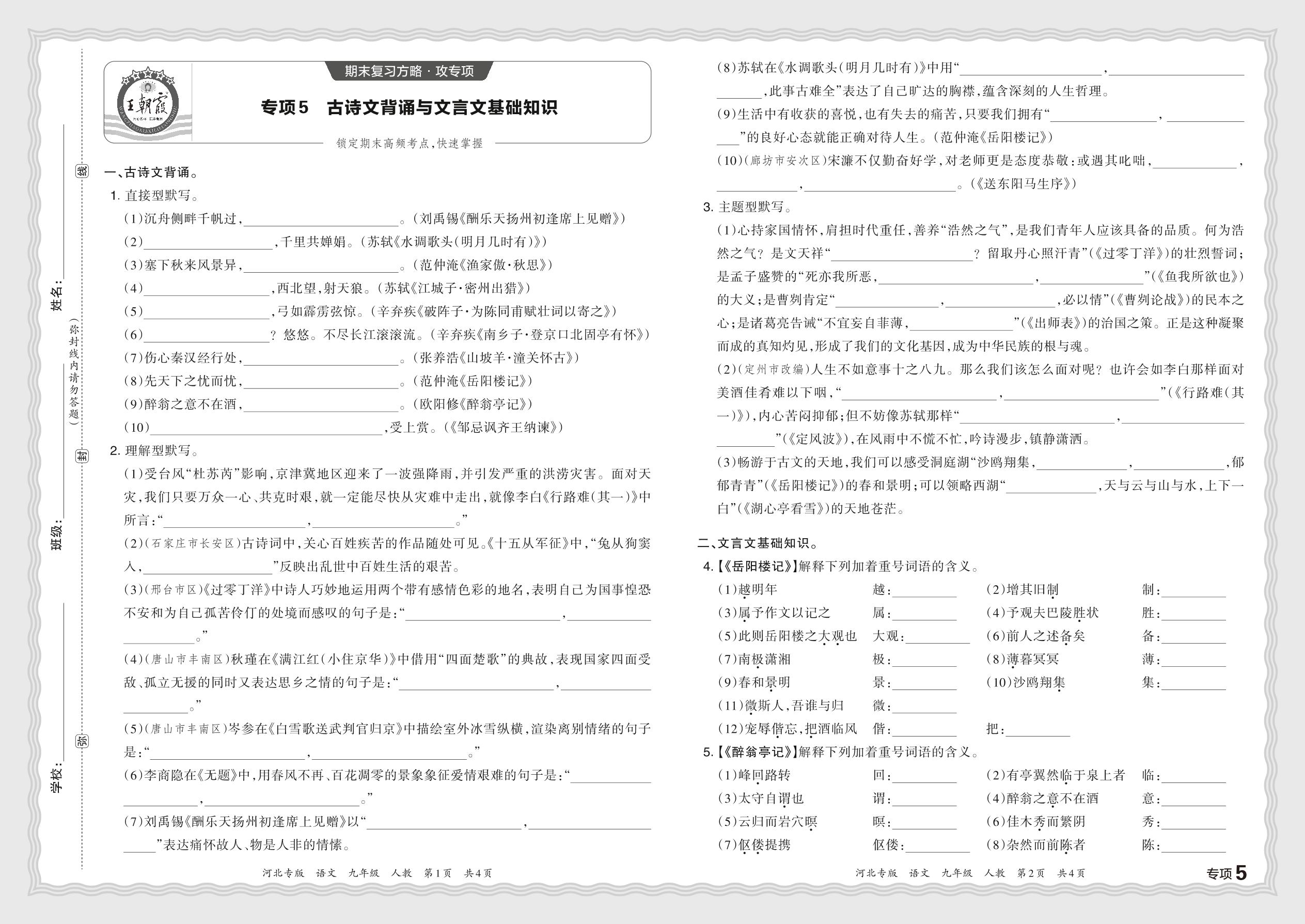 2023秋上册九年级语文人教版 期末专项卷·古诗文背诵与文言文基础知识【5】