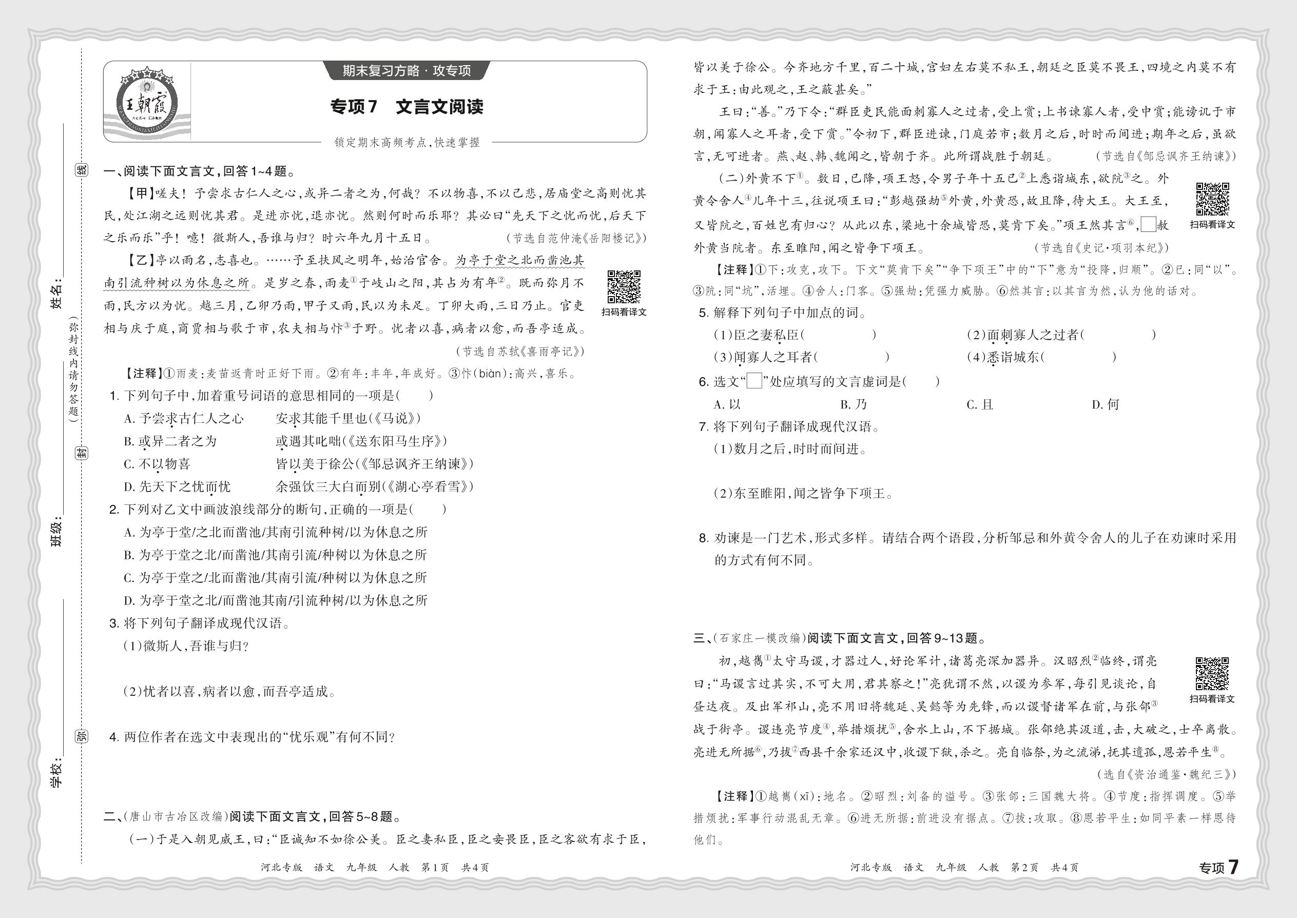 2023秋上册九年级语文人教版 期末专项卷·文言文阅读【7】
