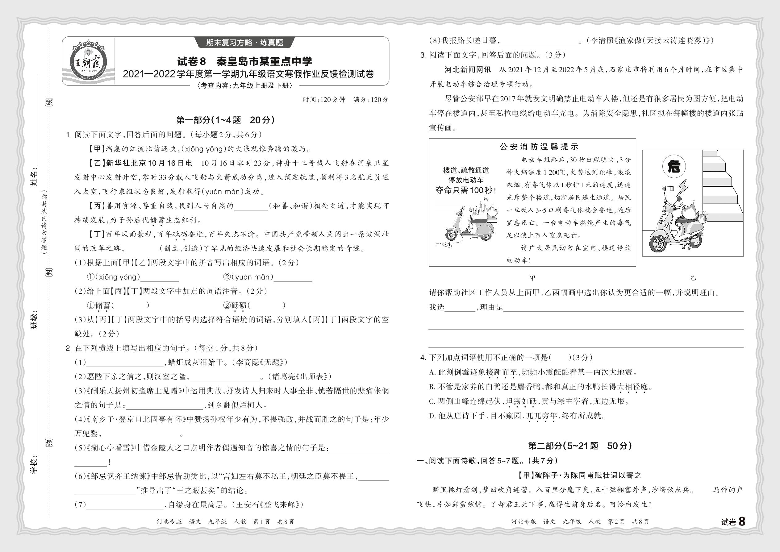 河北省秦皇岛市某重点中学2021—2022学年度第一学期九年级语文寒假作业反馈检测试卷(人教版)【8】