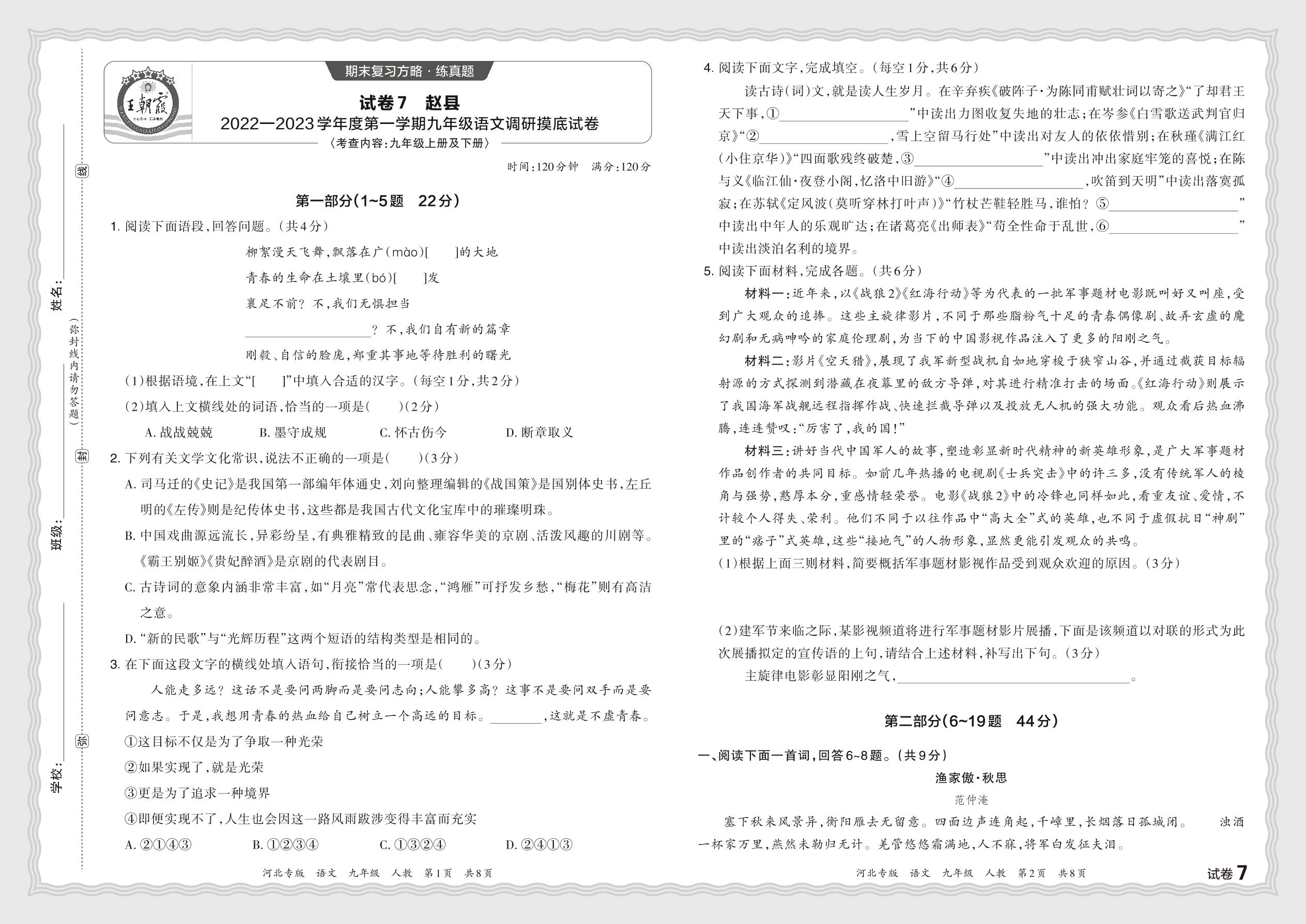 河北省石家庄市赵县2022—2023学年度第一学期九年级语文调研摸底试卷(人教版)【7】