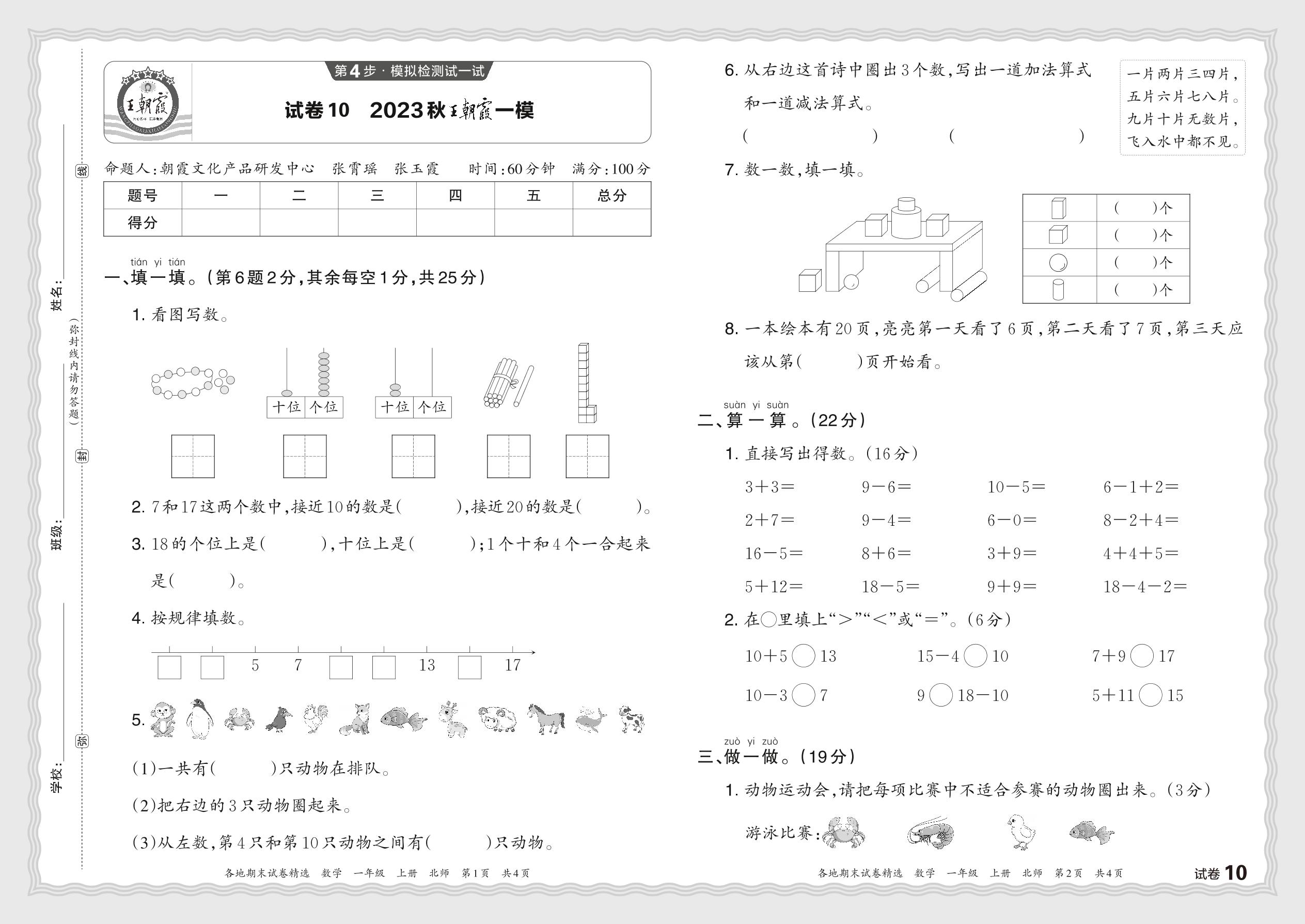 2023秋上册一年级数学北师版 王朝霞一模JX