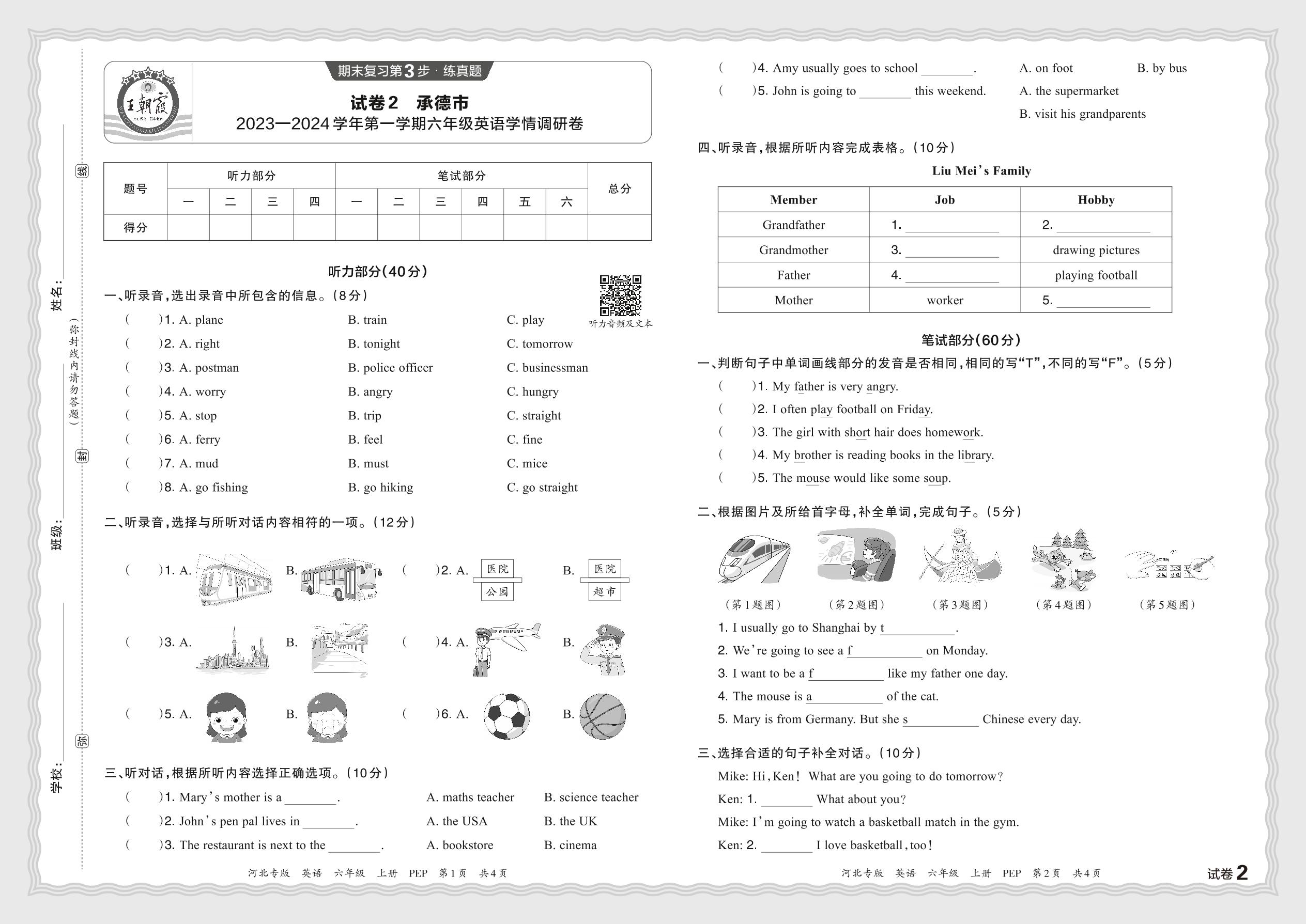河北省承德市2023—2024学年第一学期六年级英语学情调研卷(PEP版)【2】