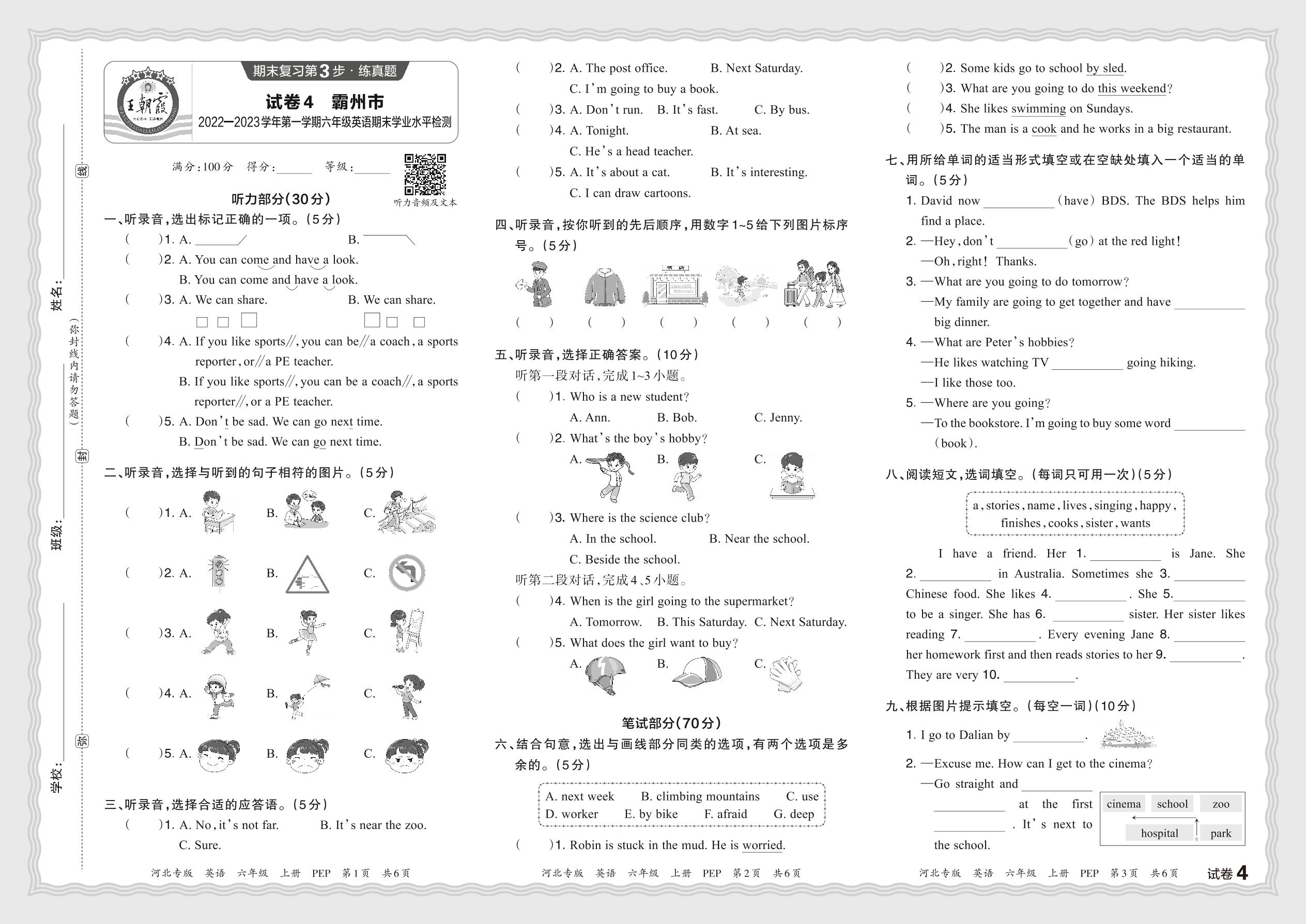 河北省廊坊市霸州市2022—2023学年第一学期六年级英语期末学业水平检测(PEP版)【4】