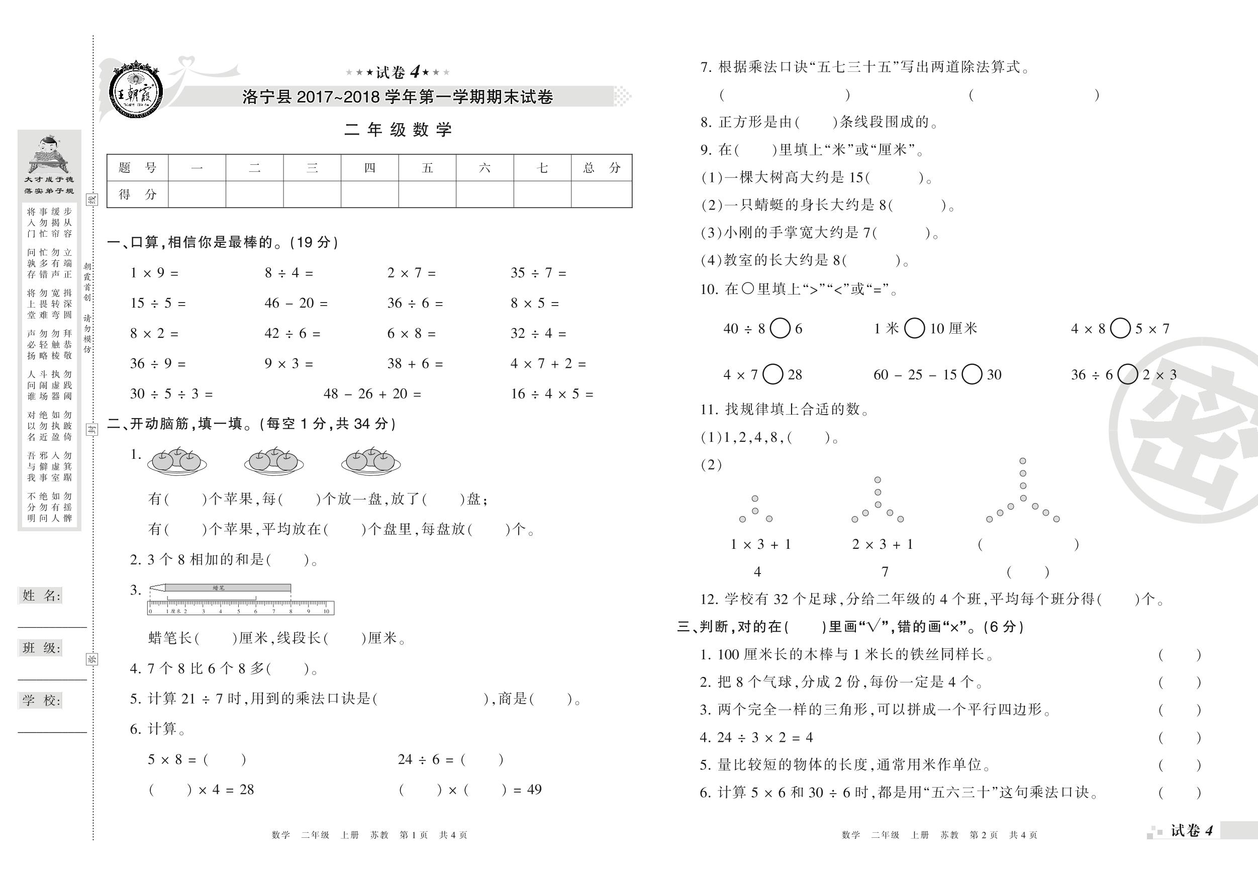2017-2018学年第一学期洛阳市洛宁县二年级数学试卷(苏教版)【4】