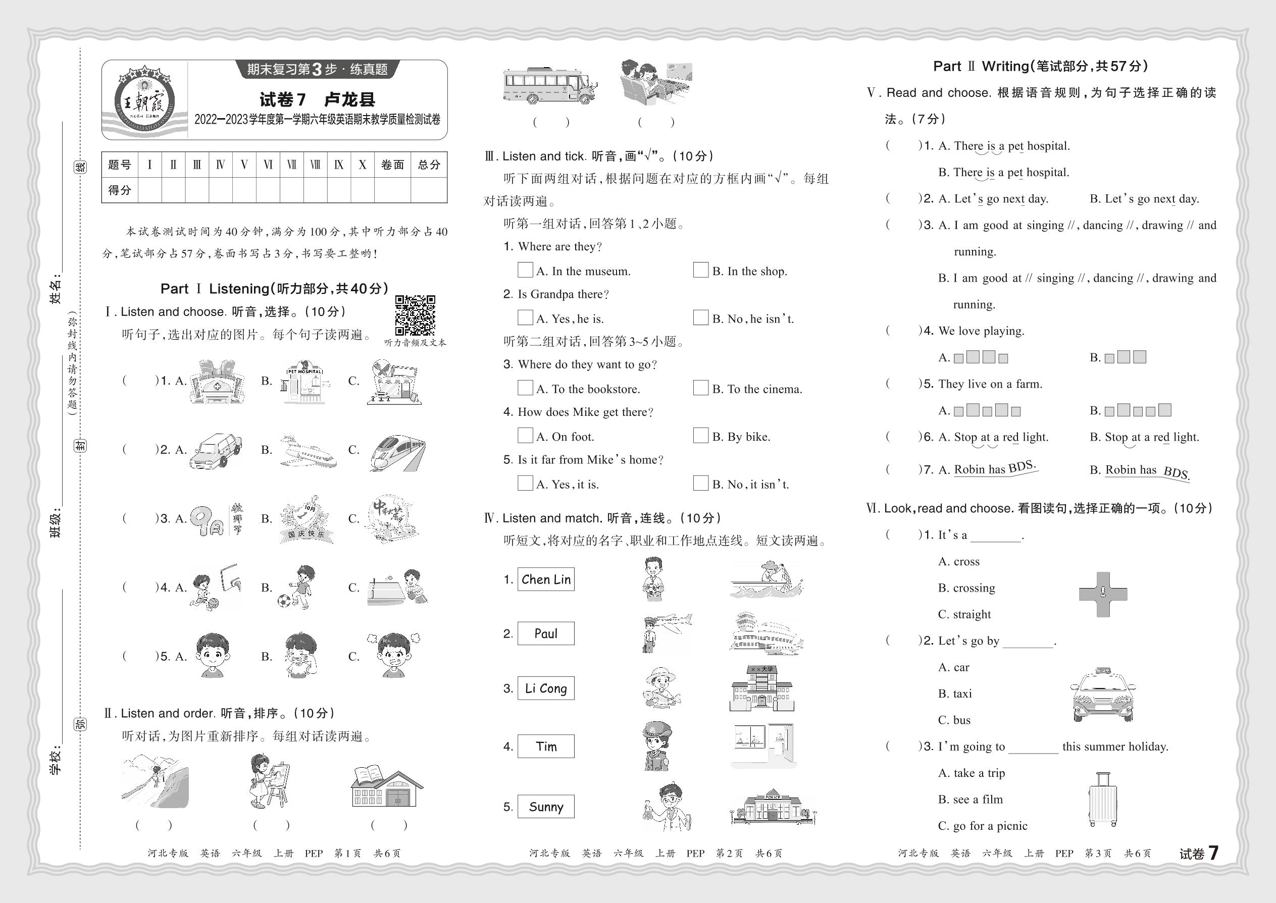 河北省秦皇岛市卢龙县2022—2023学年度第一学期六年级英语期末教学质量检测试卷(PEP版)【7】