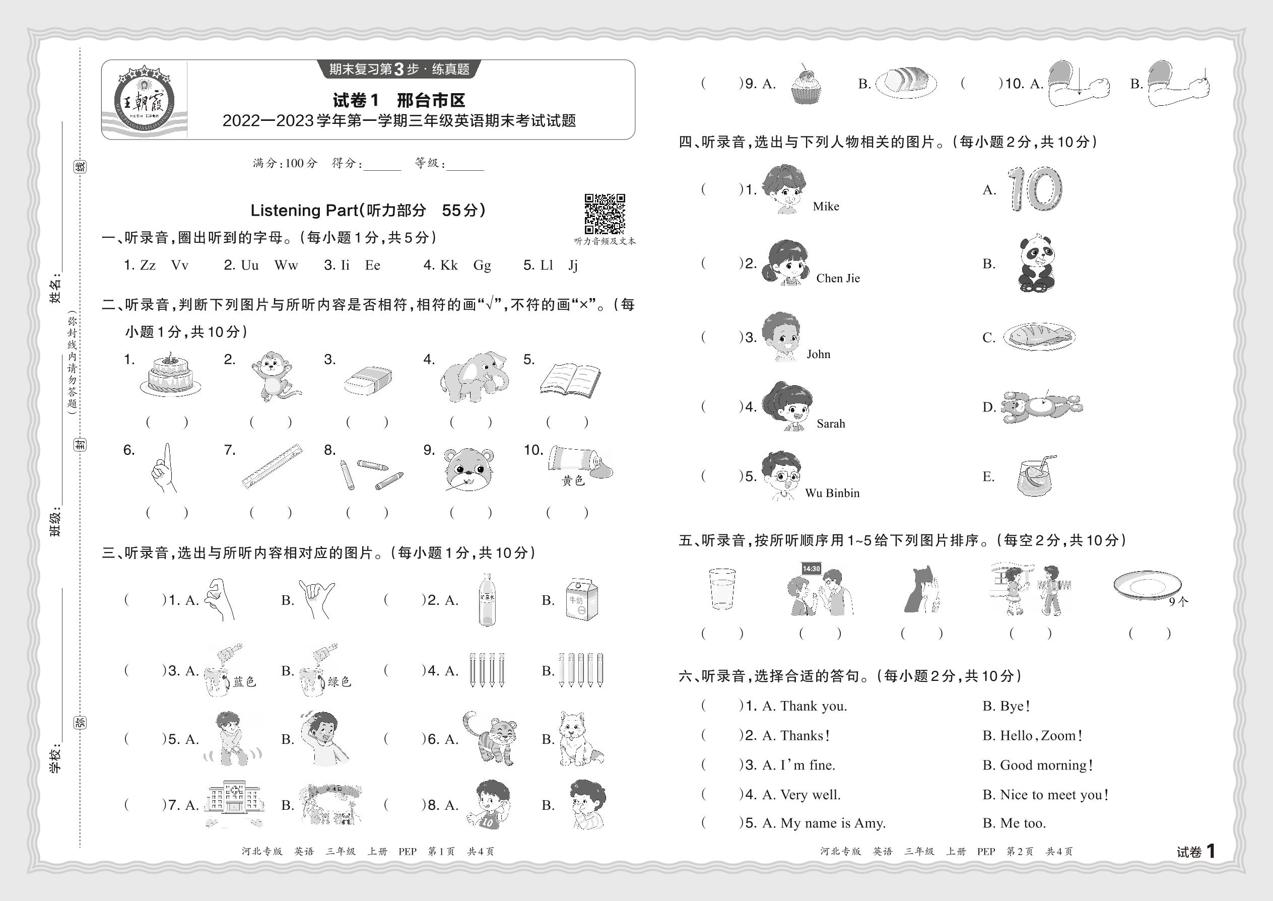 河北省邢台市区2022—2023学年第一学期三年级英语期末试题(PEP版)【1】