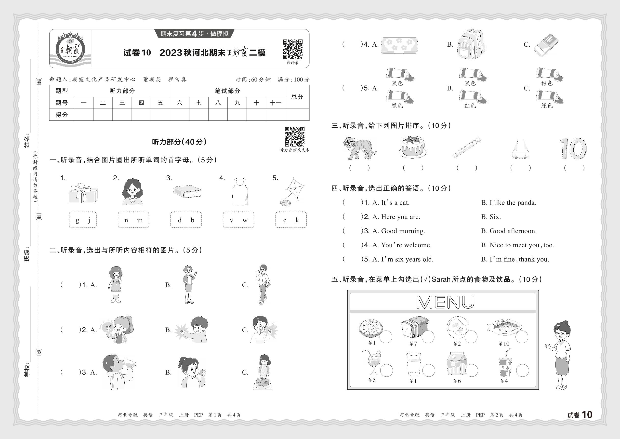 三年级英语人教PEP版(三起始)上册期末卷