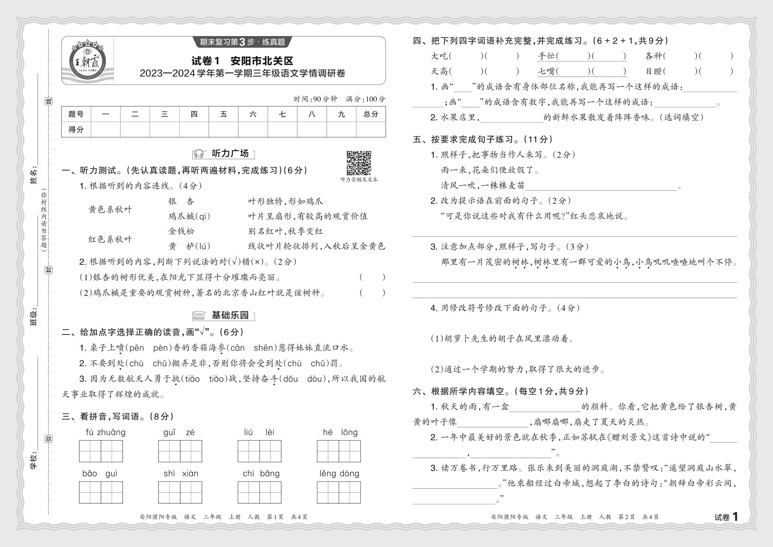 河南省安阳市北关区2023—2024学年第一学期三年级语文学情调研卷(人教版)【1】