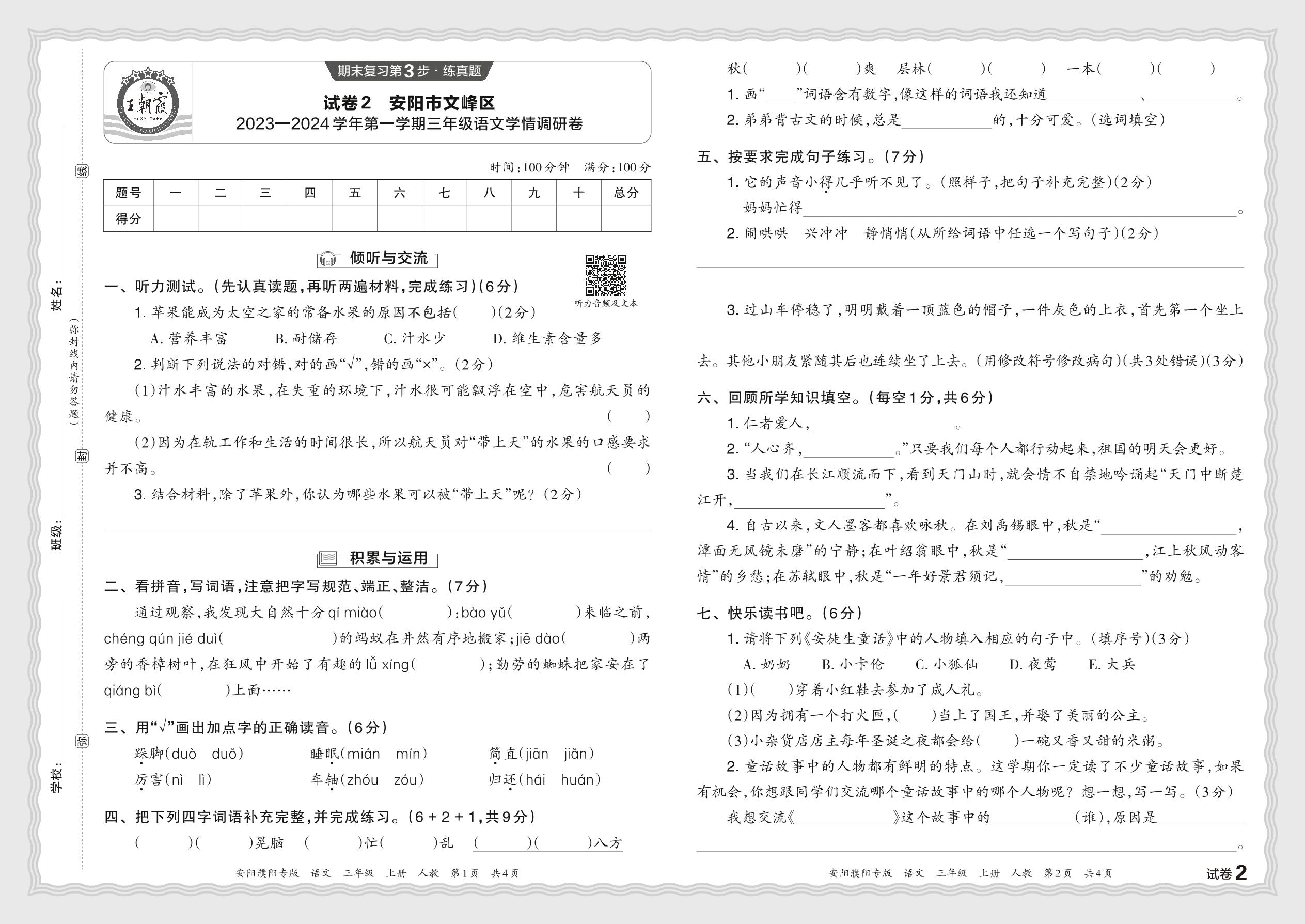河南省安阳市文峰区2023—2024学年第一学期三年级语文学情调研卷(人教版)【2】