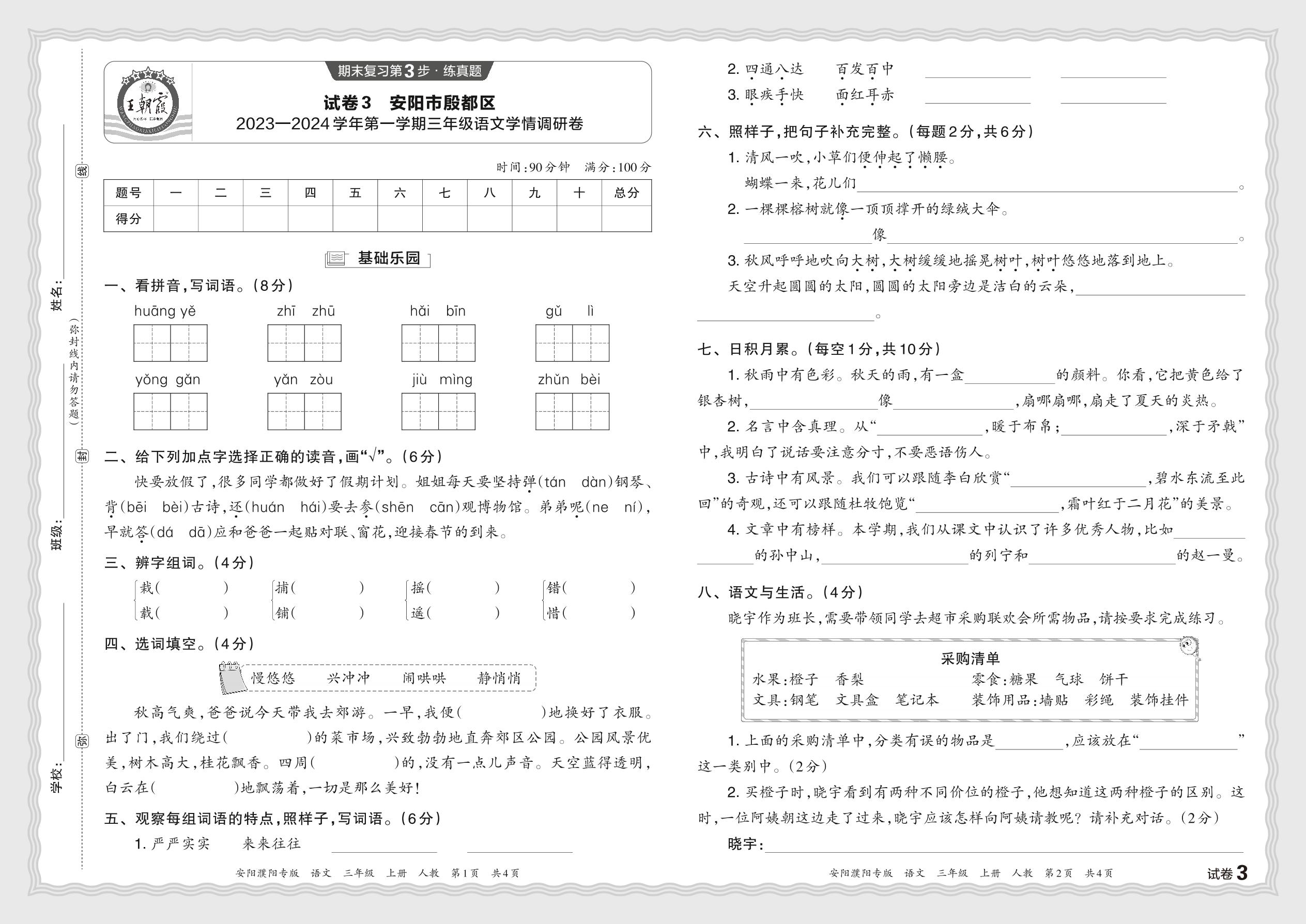 河南省安阳市殷都区2023—2024学年第一学期三年级语文学情调研卷(人教版)【3】