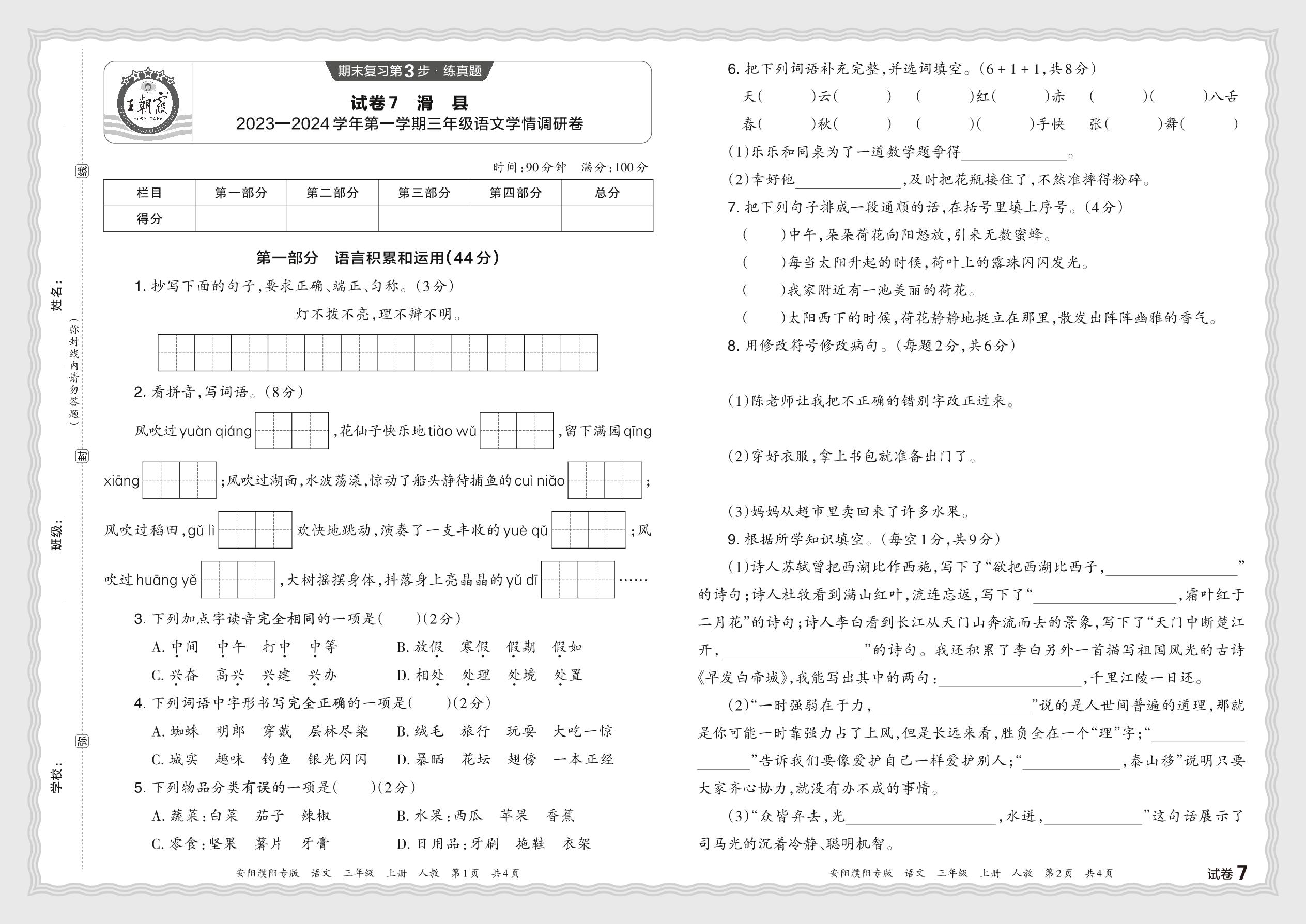 河南省安阳市滑县2023—2024 学年第一学期三年级语文学情调研卷(人教版)【7】