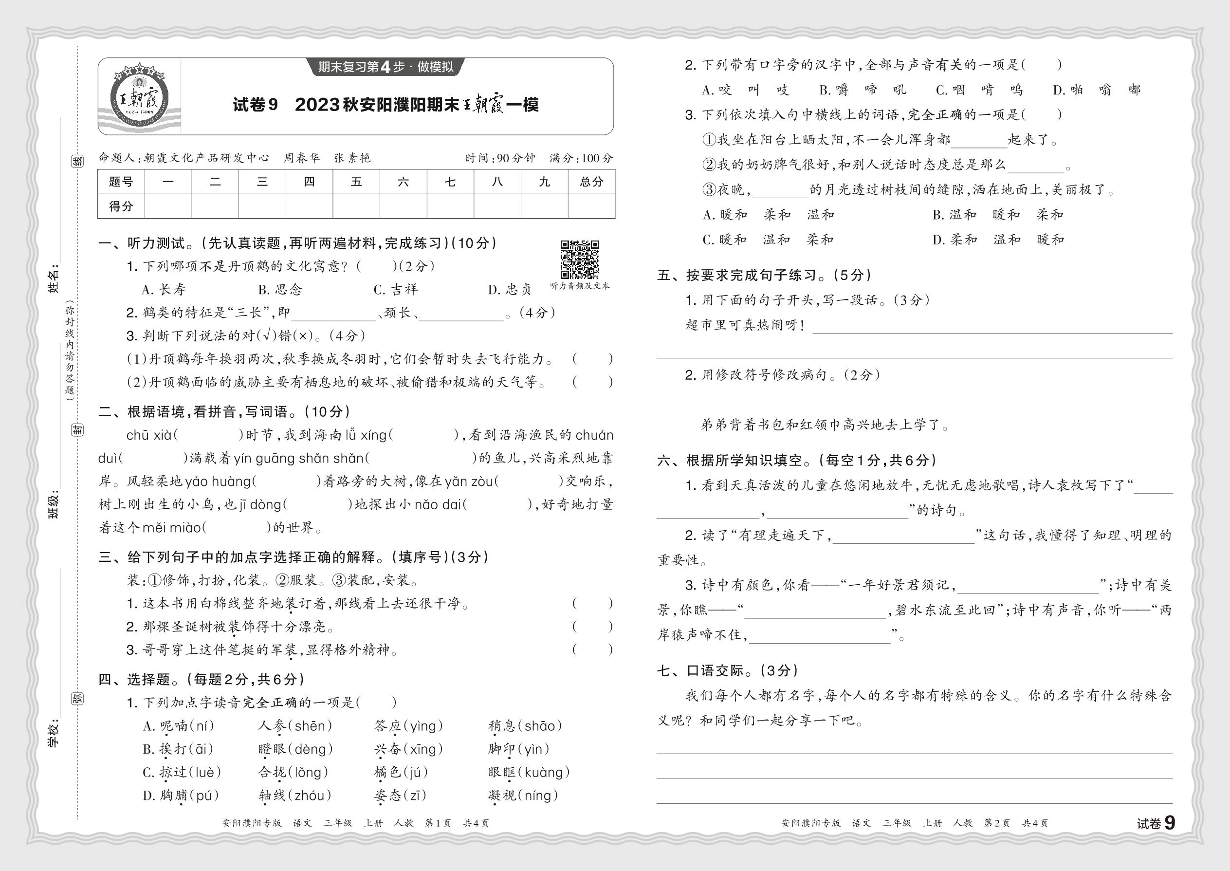 2023秋上册三年级语文人教版 河南安阳濮阳期末王朝霞一模【9】