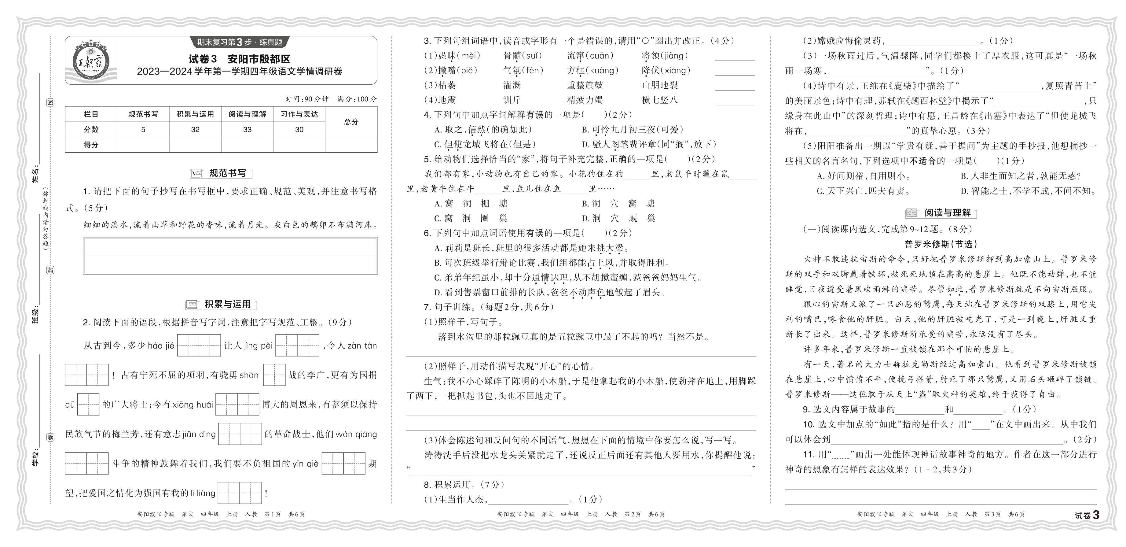 河南省安阳市殷都区2023—2024学年第一学期四年级语文学情调研卷(人教版)【3】