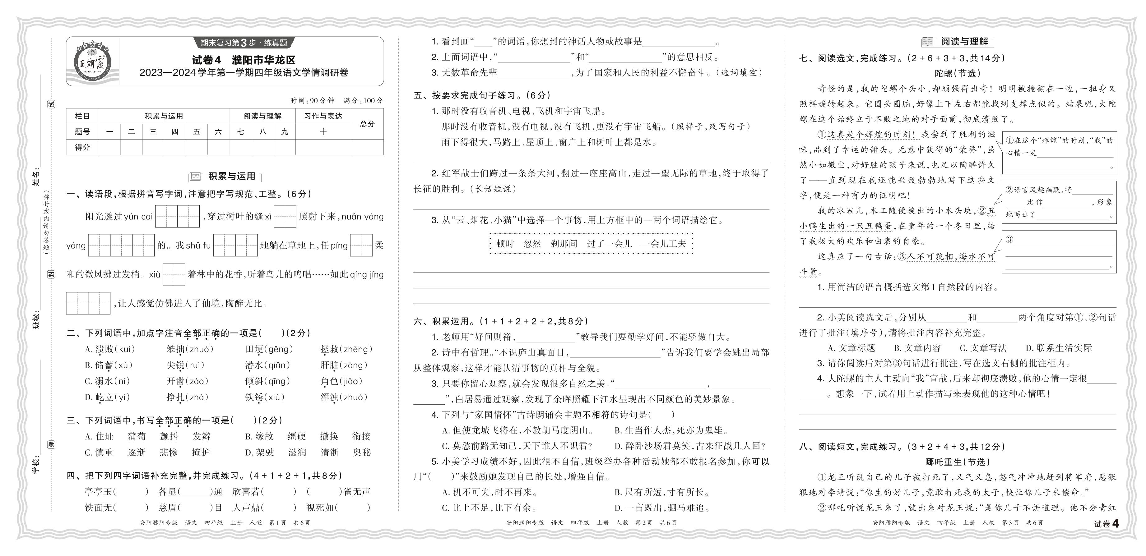 河南省濮阳市华龙区2023—2024学年第一学期四年级语文学情调研卷(人教版)【4】