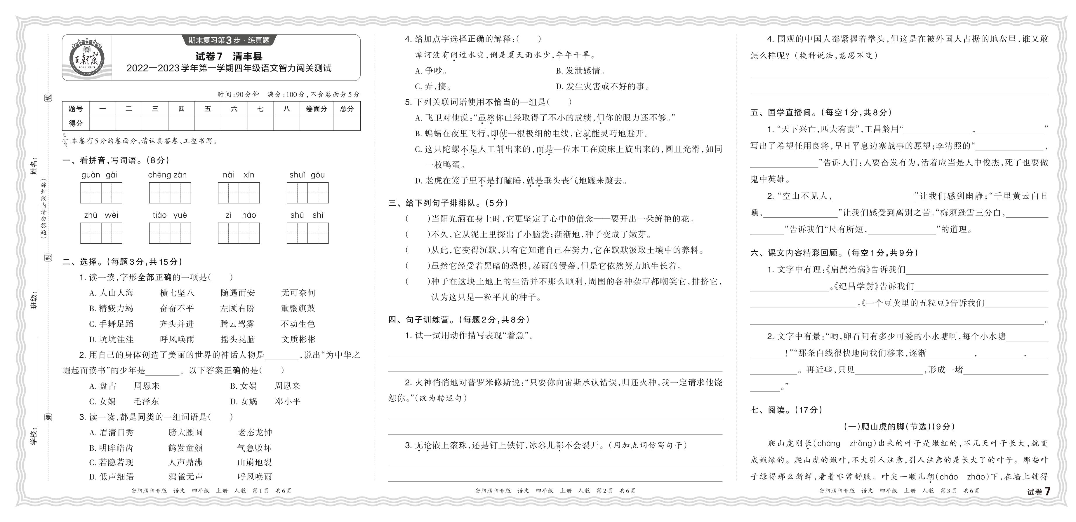 河南省濮阳市清丰县2023—2024学年第一学期四年级语文学情调研卷(人教版)【7】