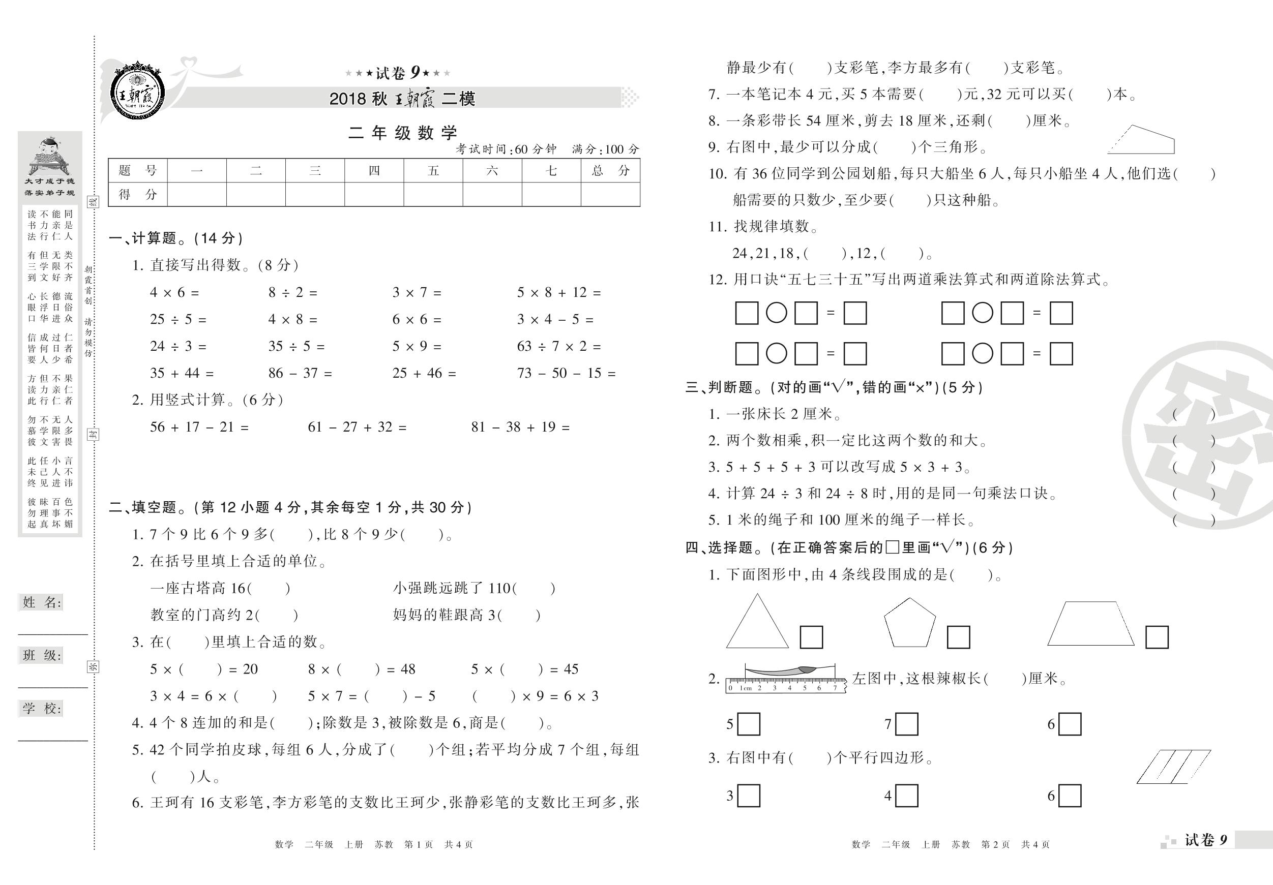 王朝霞期末模拟卷二年级上册数学(苏教版)_R210803104709【9】