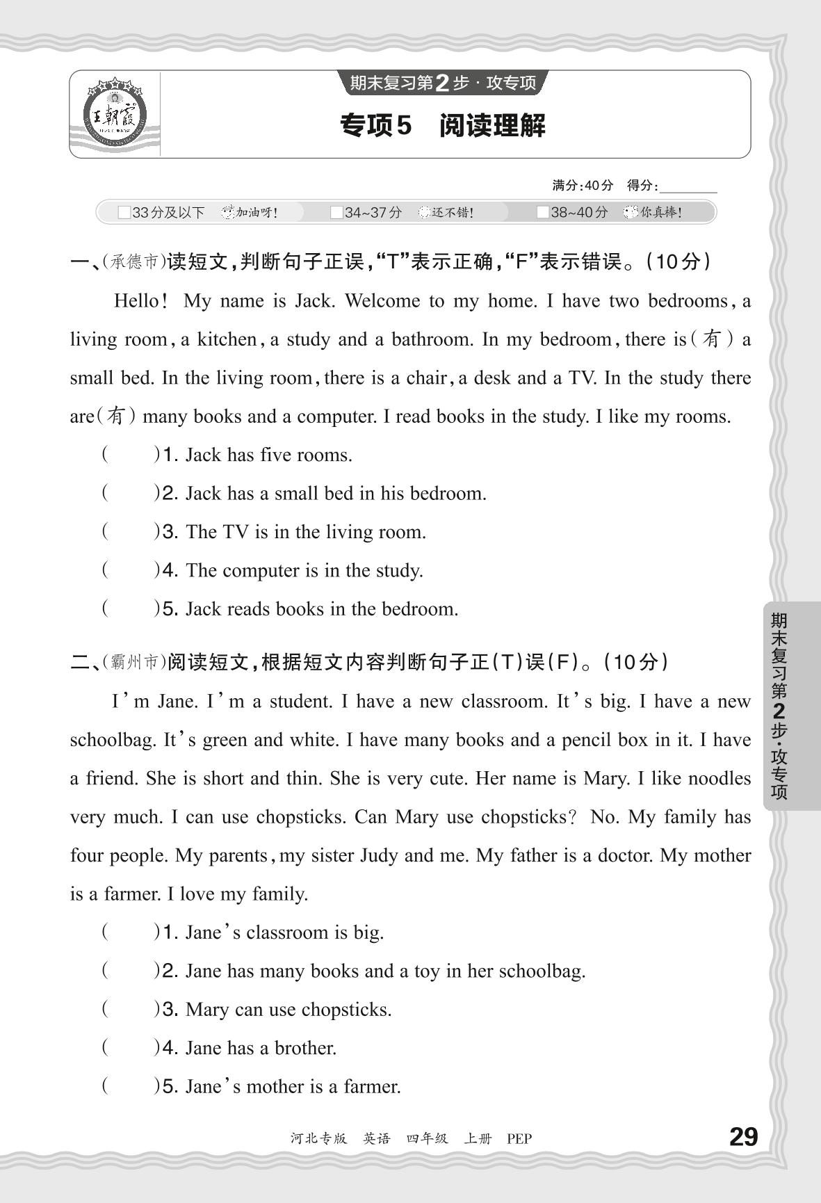 2023秋上册四年级英语人教PEP版 期末专项·阅读理解【5】