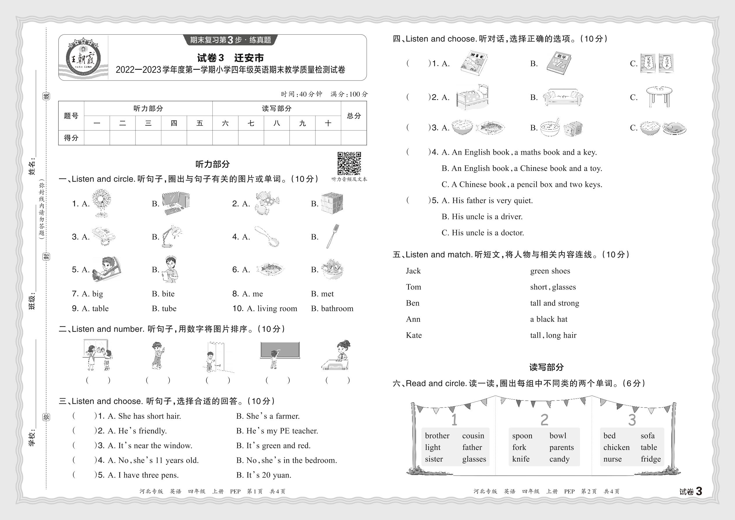 河北省唐山市迁安市2022—2023学年度第一学期小学四年级英语期末教学质量检测试卷(PEP版)【3】