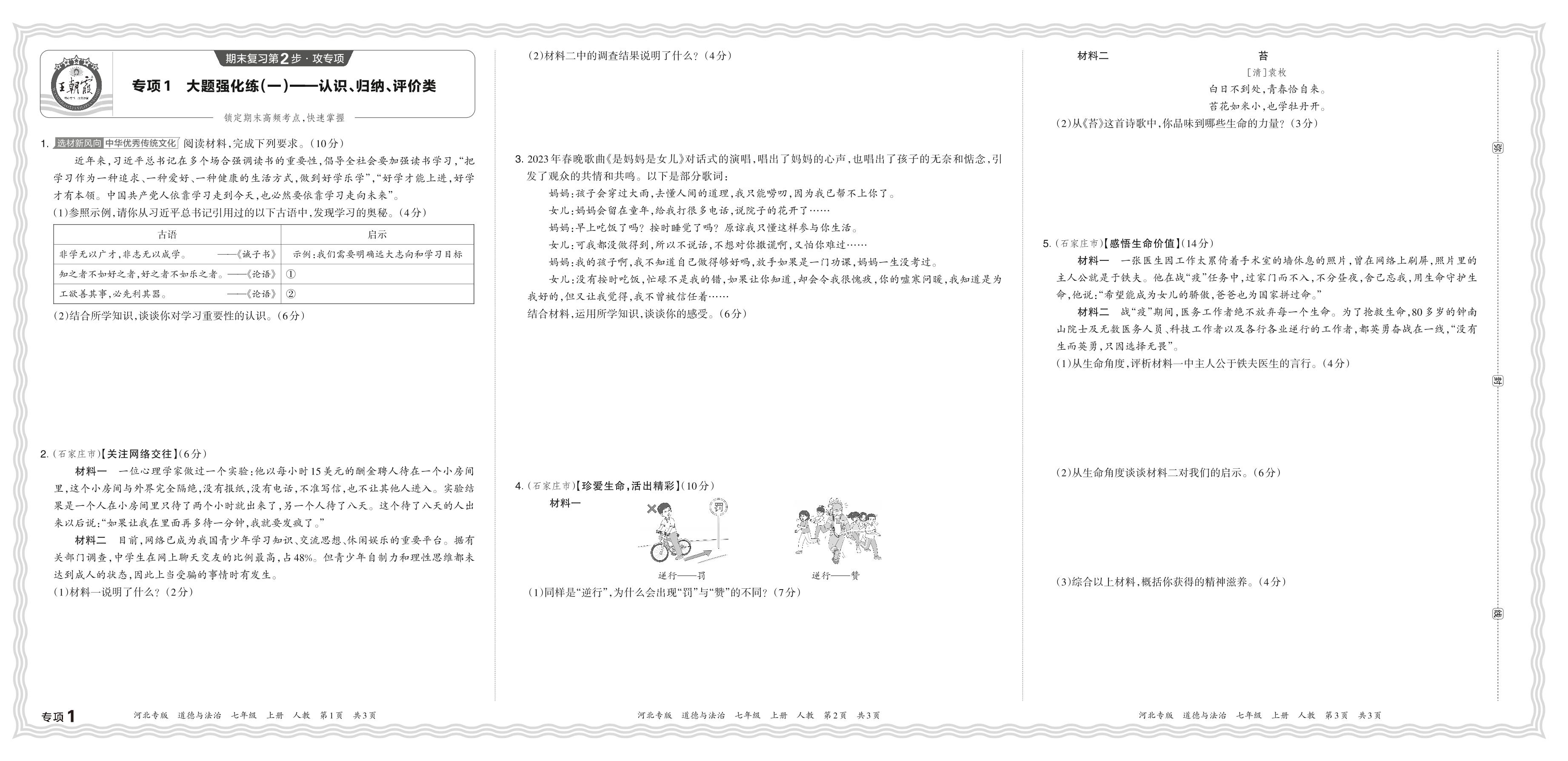 2023秋上册七年级道德与法治人教版 期末专项卷·大题强化练(一)——认识、归纳、评价类