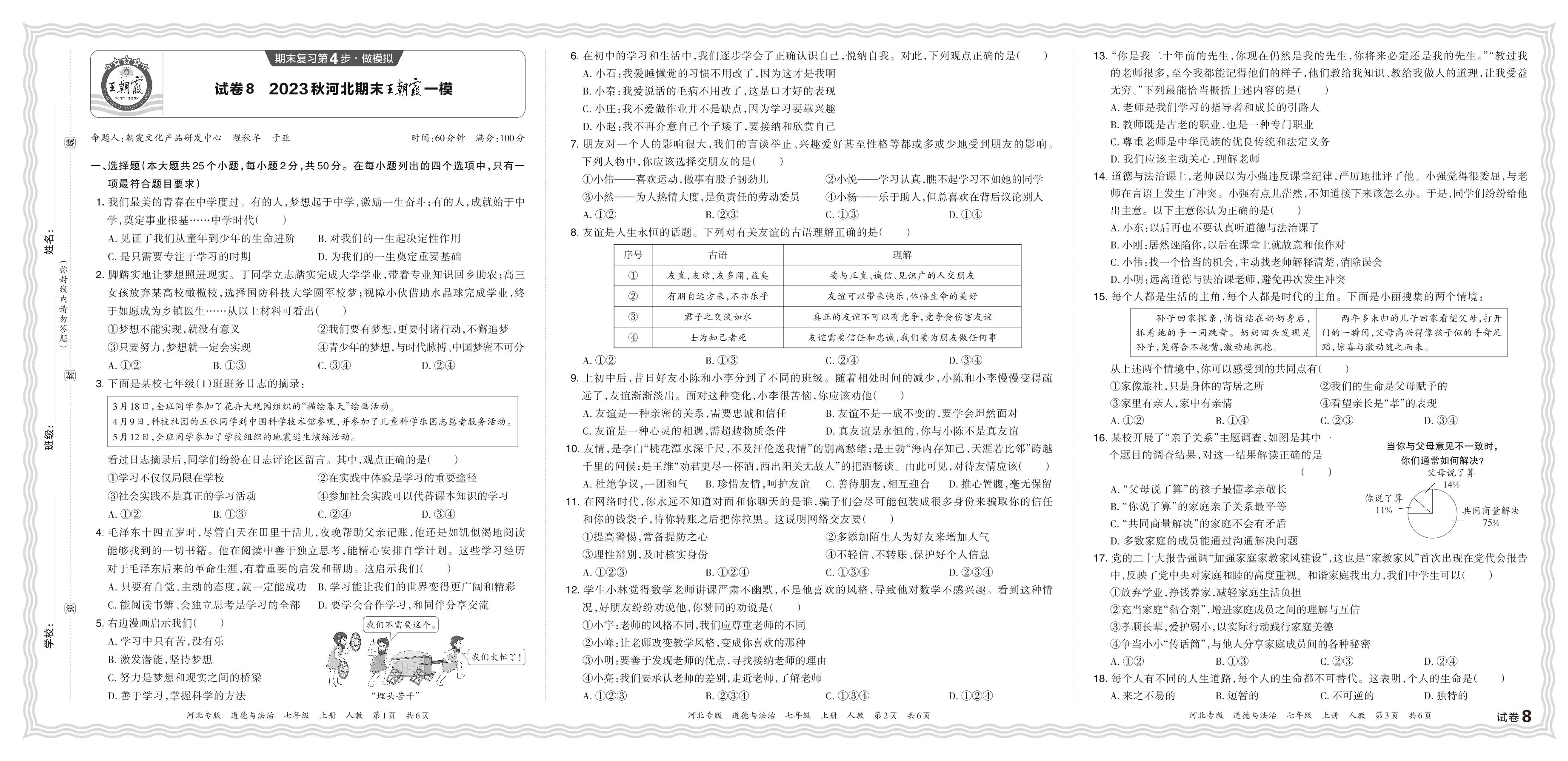 2023秋上册七年级道德与法治人教版 河北期末王朝霞一模