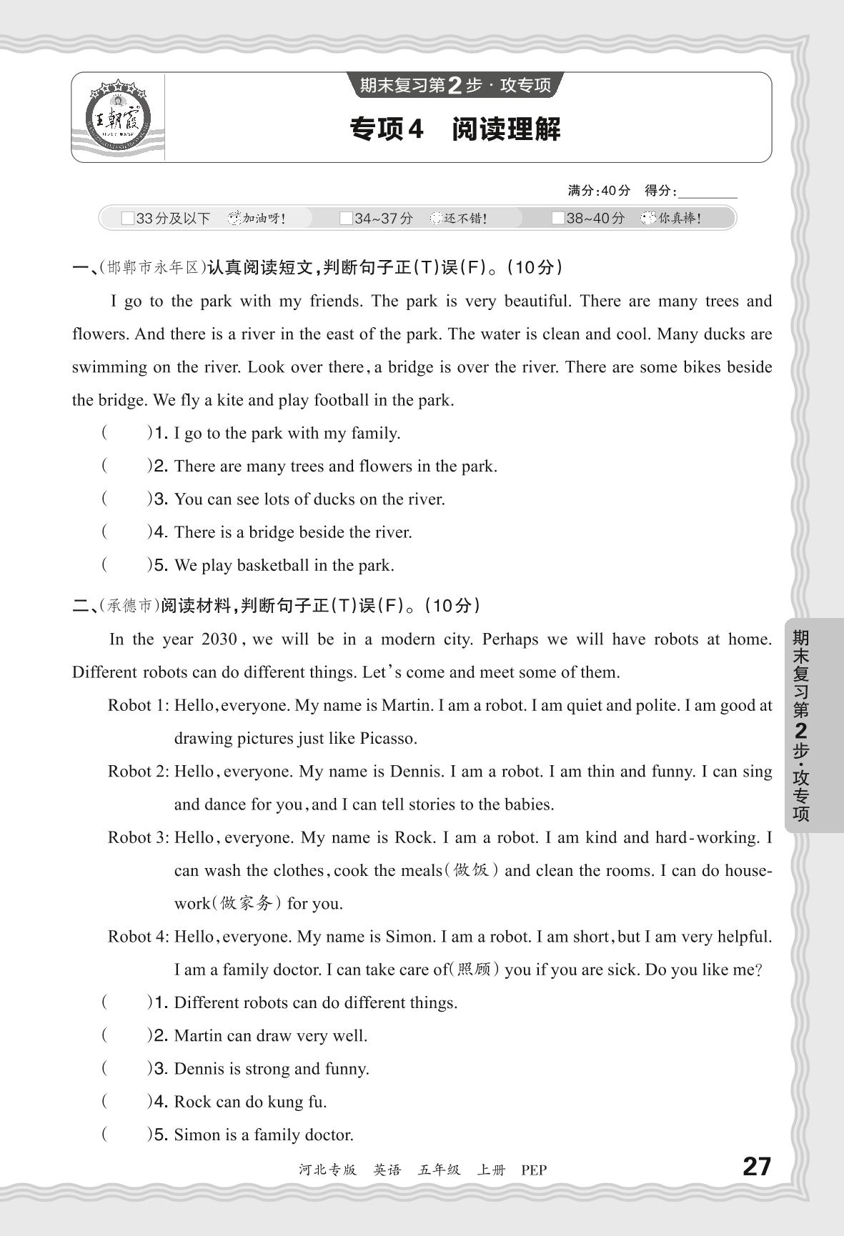 五年级英语人教PEP版(三起始)上册专项卷
