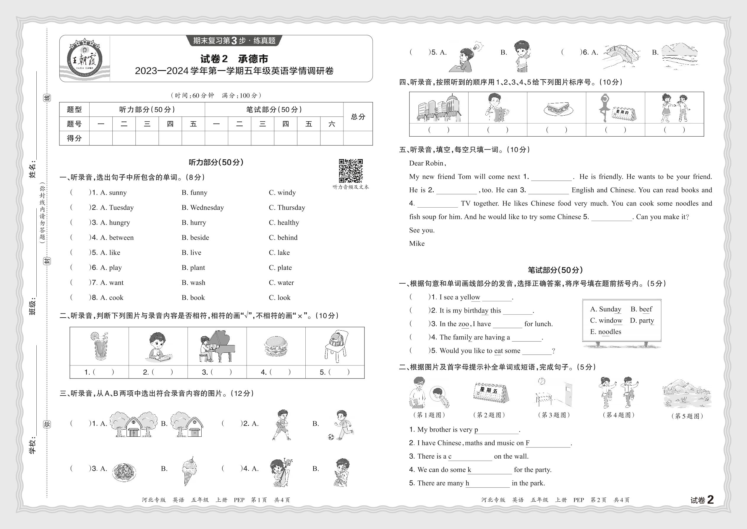 河北省承德市2023—2024学年第一学期五年级英语学情调研卷(PEP版)【2】