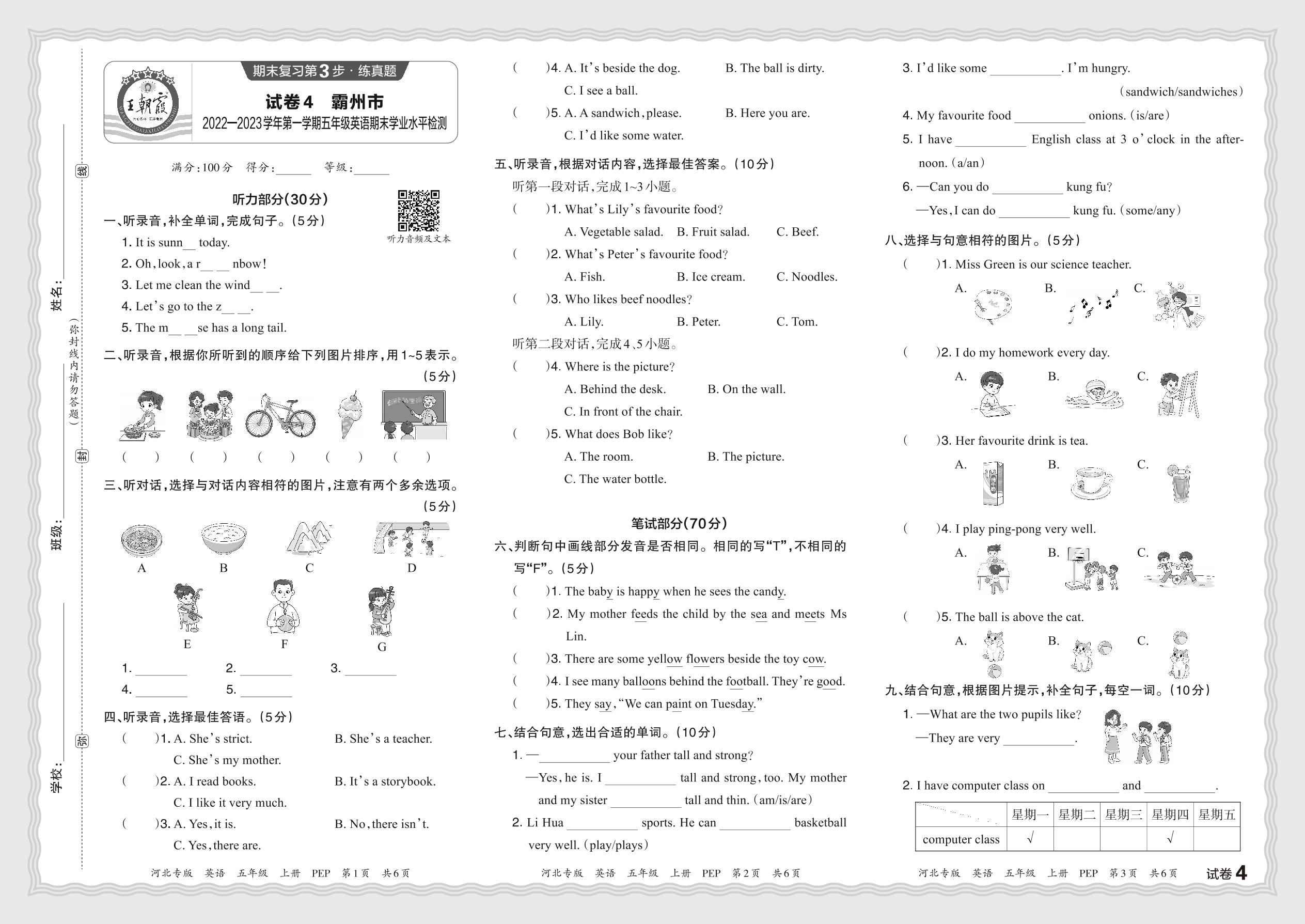 河北省廊坊市霸州市2022—2023学年第一学期五年级英语期末学业水平检测(PEP版)【4】
