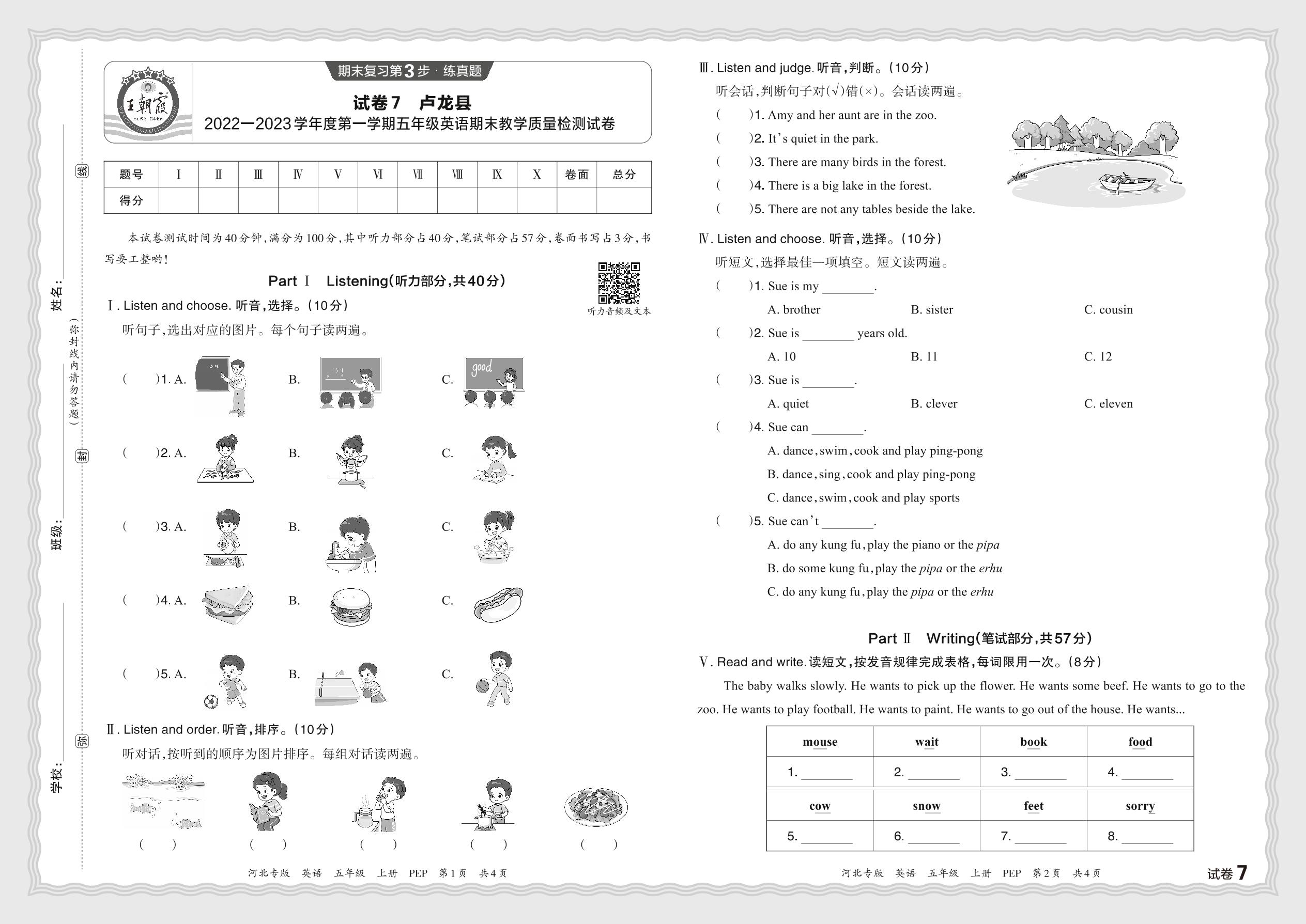 河北省秦皇岛市卢龙县2022—2023学年度第一学期五年级英语期末教学质量检测试卷(PEP版)【7】