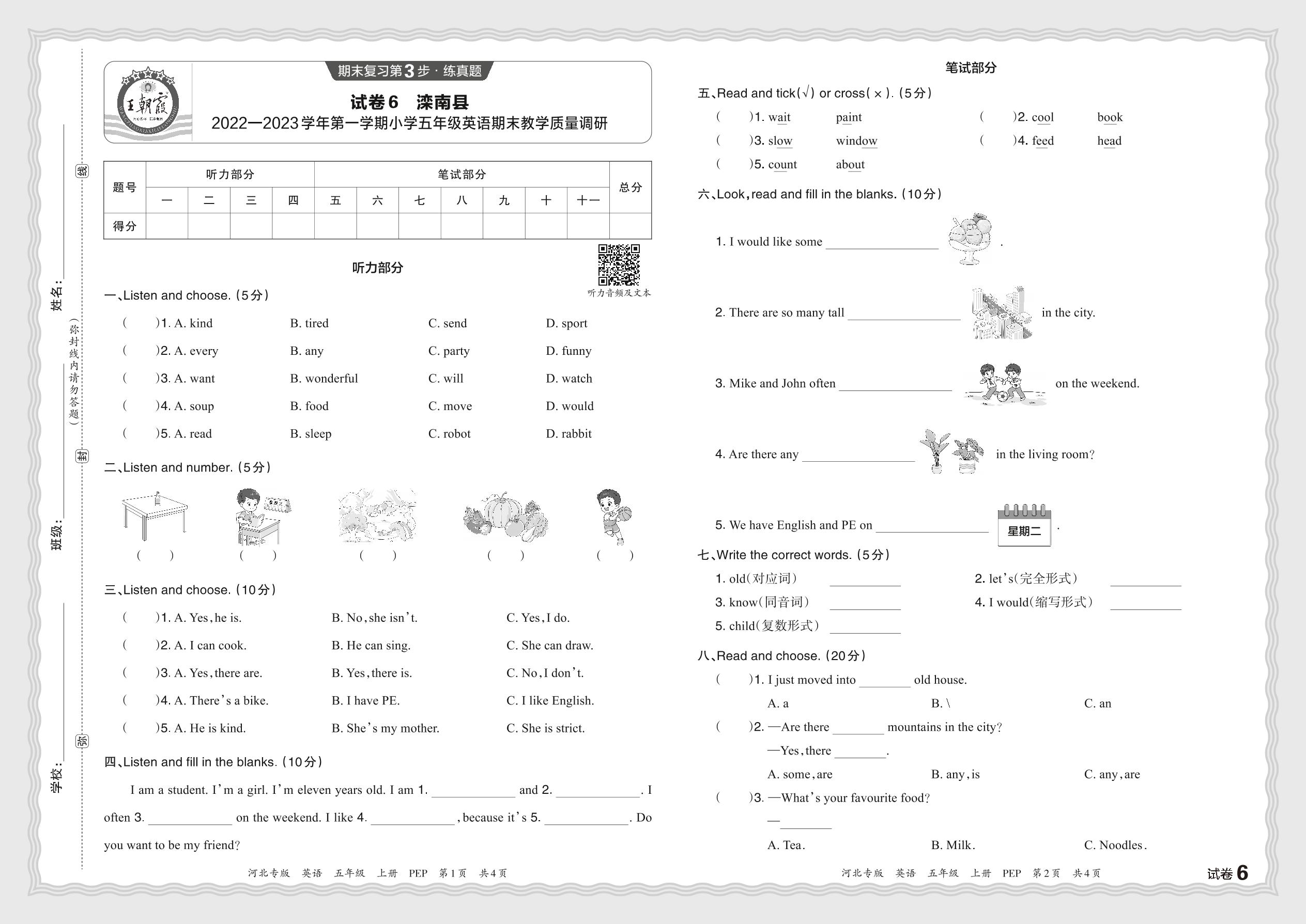河北省唐山市滦南县2022—2023学年第一学期小学五年级英语期末教学质量调研(PEP版)【6】