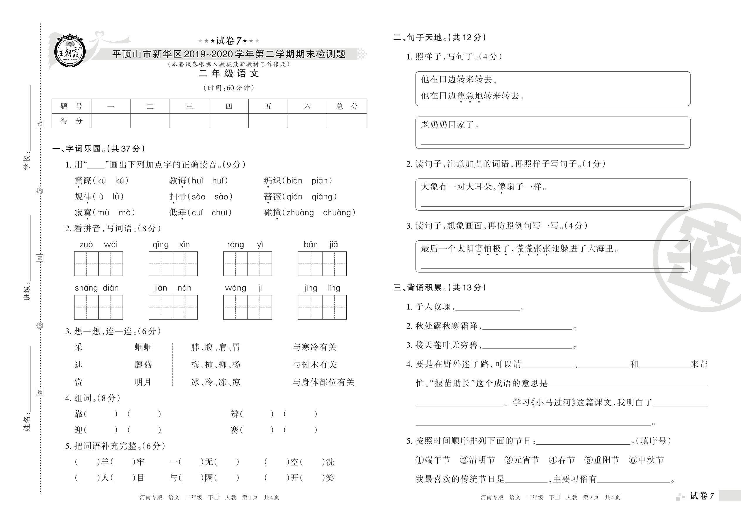 2019-2020学年第二学期平顶山市新华区二年级语文试卷(人教版)【7】