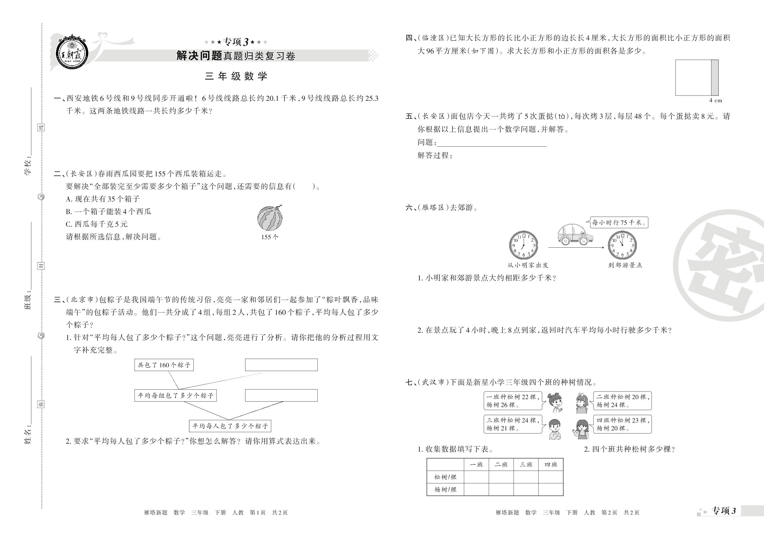 王朝霞期末专项卷——解决问题真题归类复习、新颖题速递:生活与数学三年级下册数学(人教版)_R21080483826【0】
