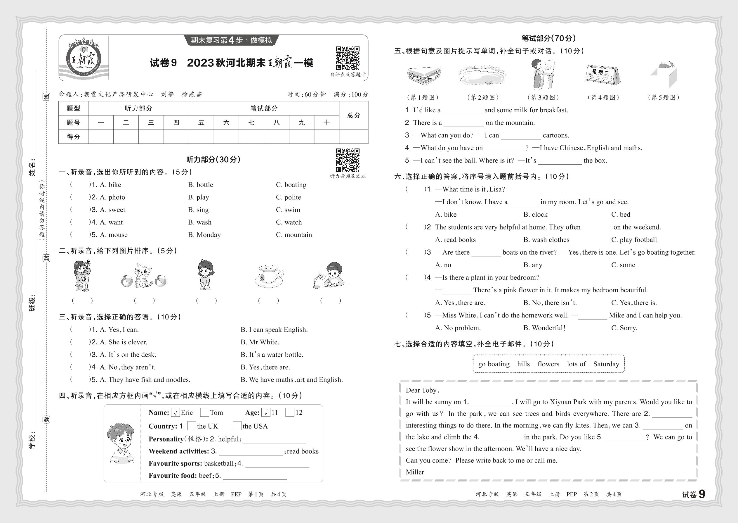 2023秋上册五年级英语人教PEP版 河北期末王朝霞一模