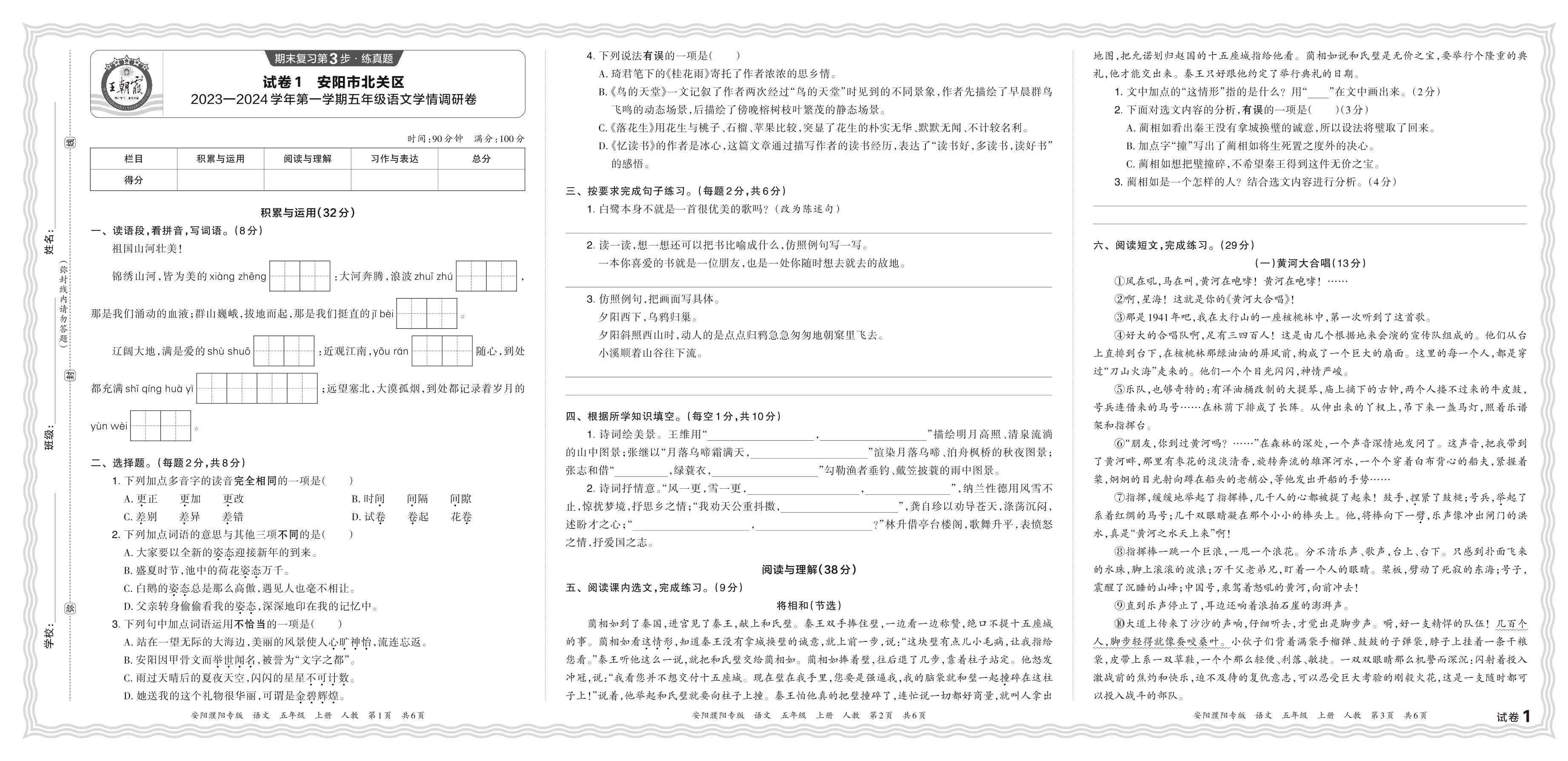 河南省安阳市北关区2023—2024学年第一学期五年级语文学情调研卷(人教版)【1】