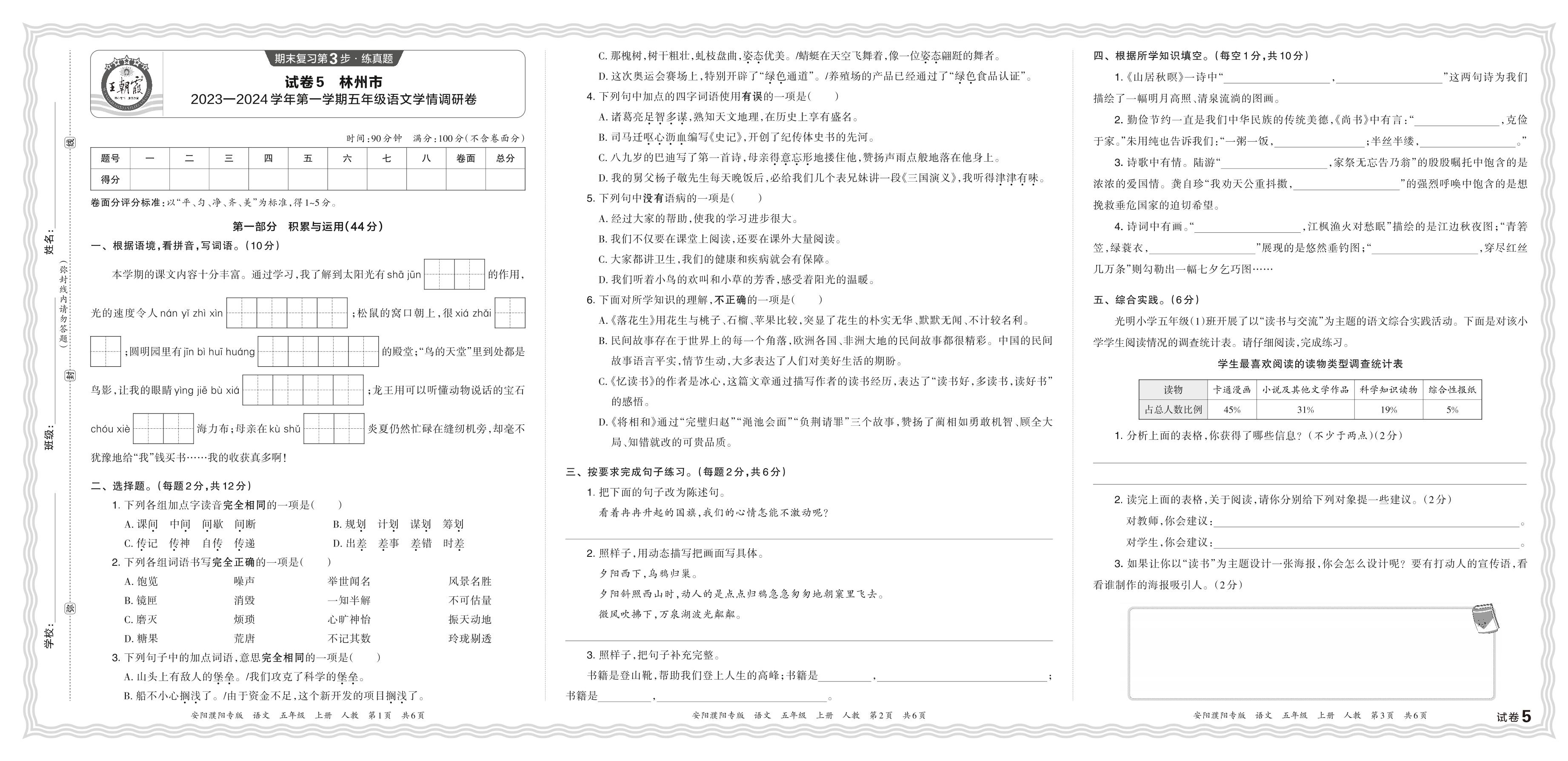 河南省林州市2023—2024学年第一学期五年级语文学情调研卷(人教版)【5】