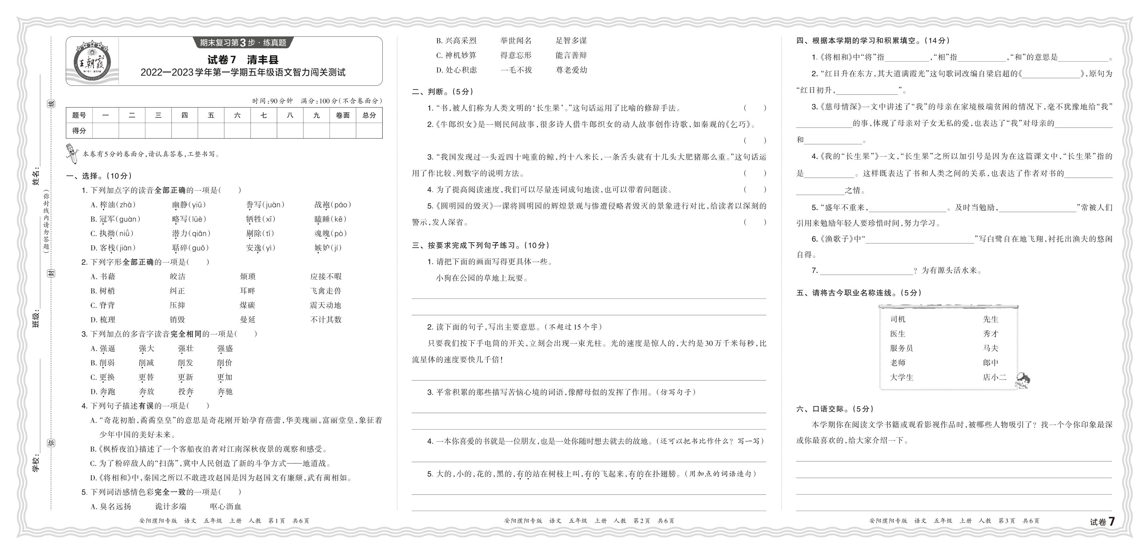 河南省安阳市清丰县2023—2024学年第一学期五年级语文学情调研卷(人教版)【7】