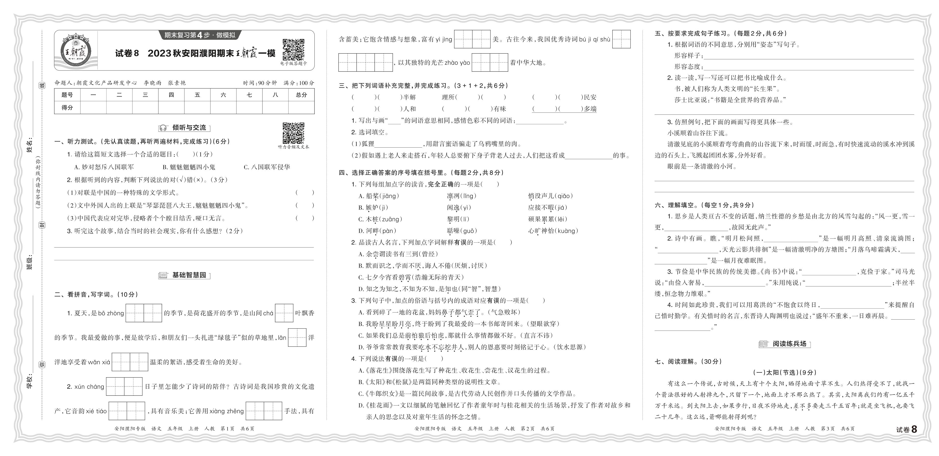 2023秋上册五年级语文人教版 河南安阳濮阳期末王朝霞一模【8】
