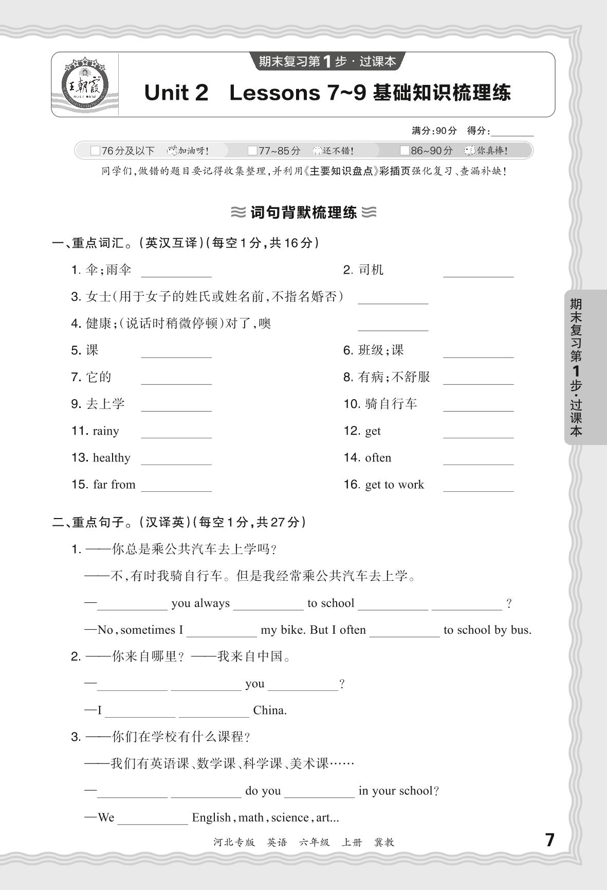 2023秋上册六年级英语冀教版 期末过课本·Unit 2 Lessons 7-9 基础知识梳理练