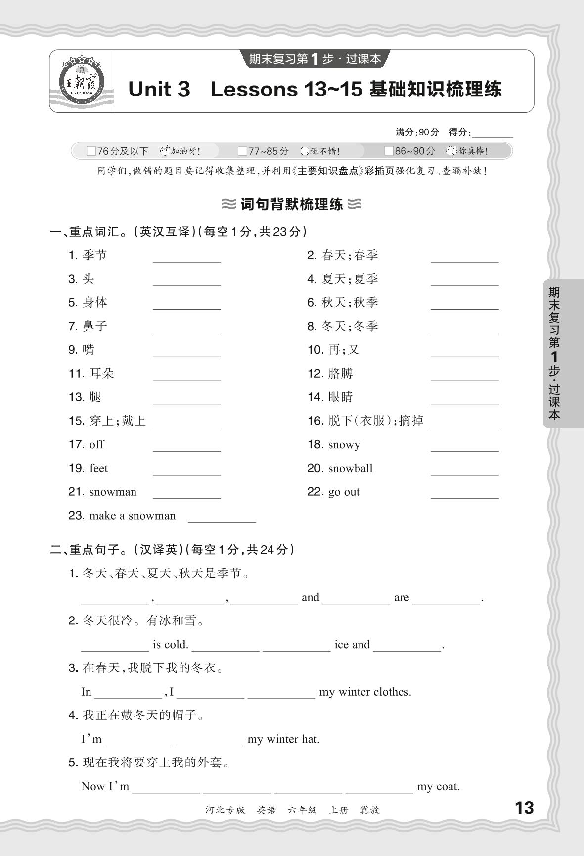 2023秋上册六年级英语冀教版 期末过课本·Unit 3 Lessons 13-15 基础知识梳理练