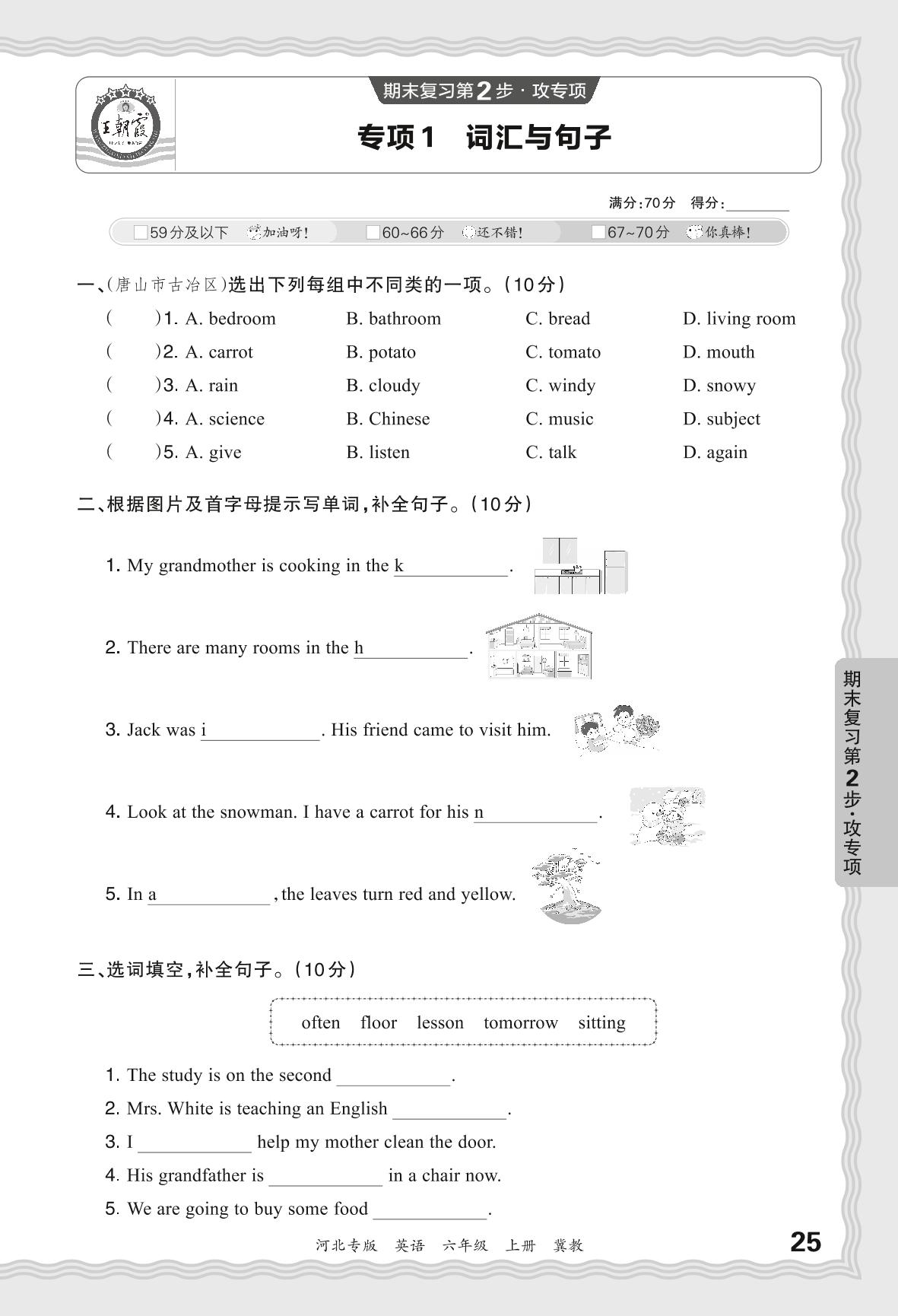 2023秋上册六年级英语冀教版 期末专项·词汇与句子【1】