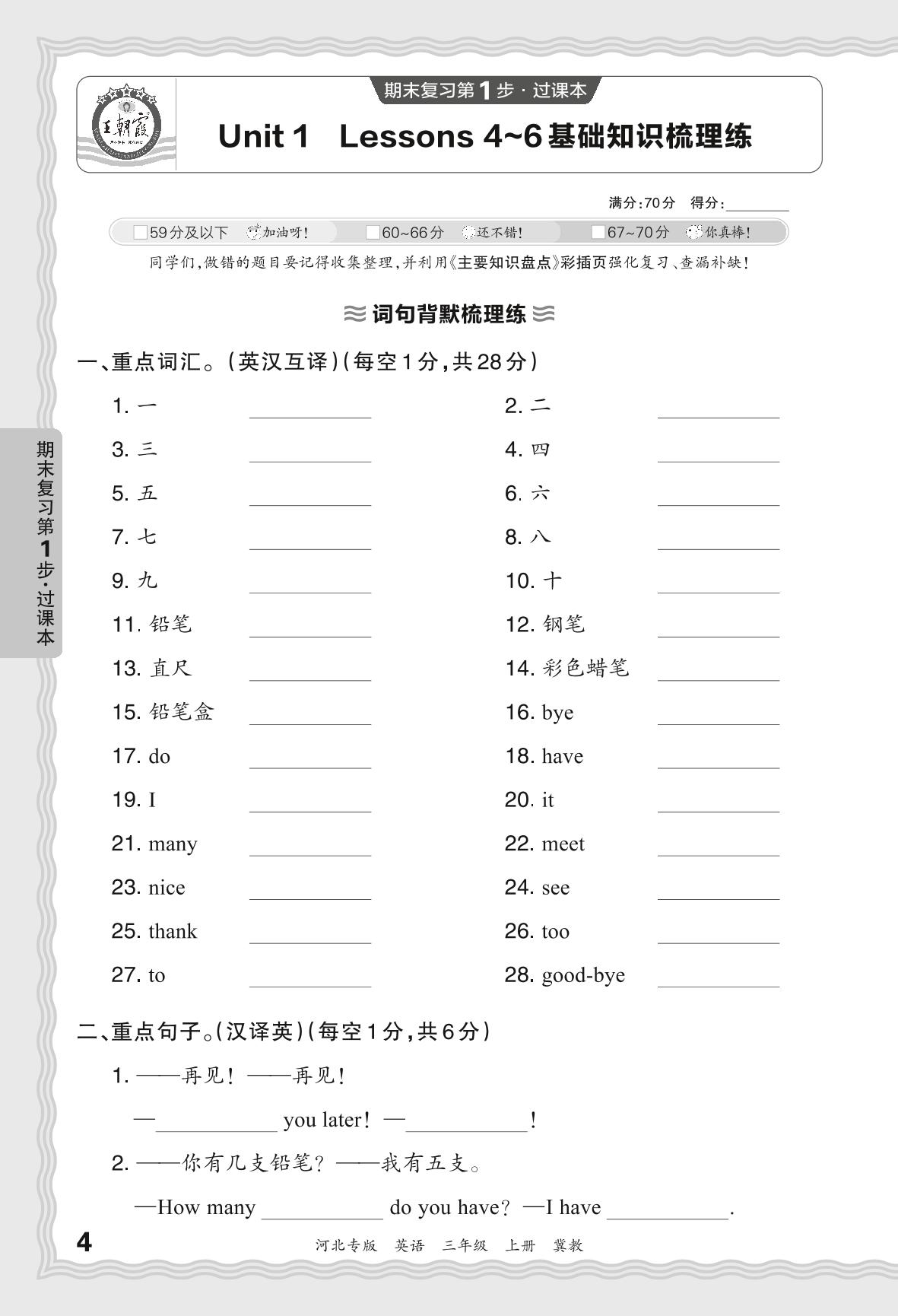 2023秋上册三年级英语冀教版 期末过课本·Unit 1 Lessons 4-6 基础知识梳理练