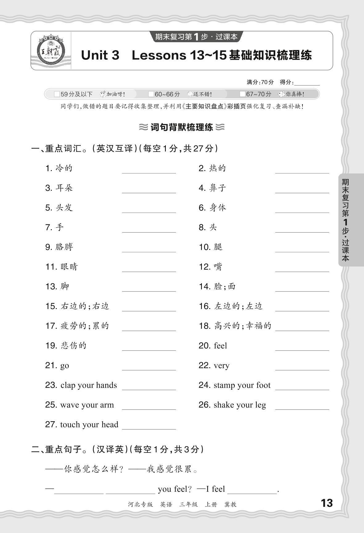 2023秋上册三年级英语冀教版 期末过课本·Unit 3 Lessons 13-15 基础知识梳理练