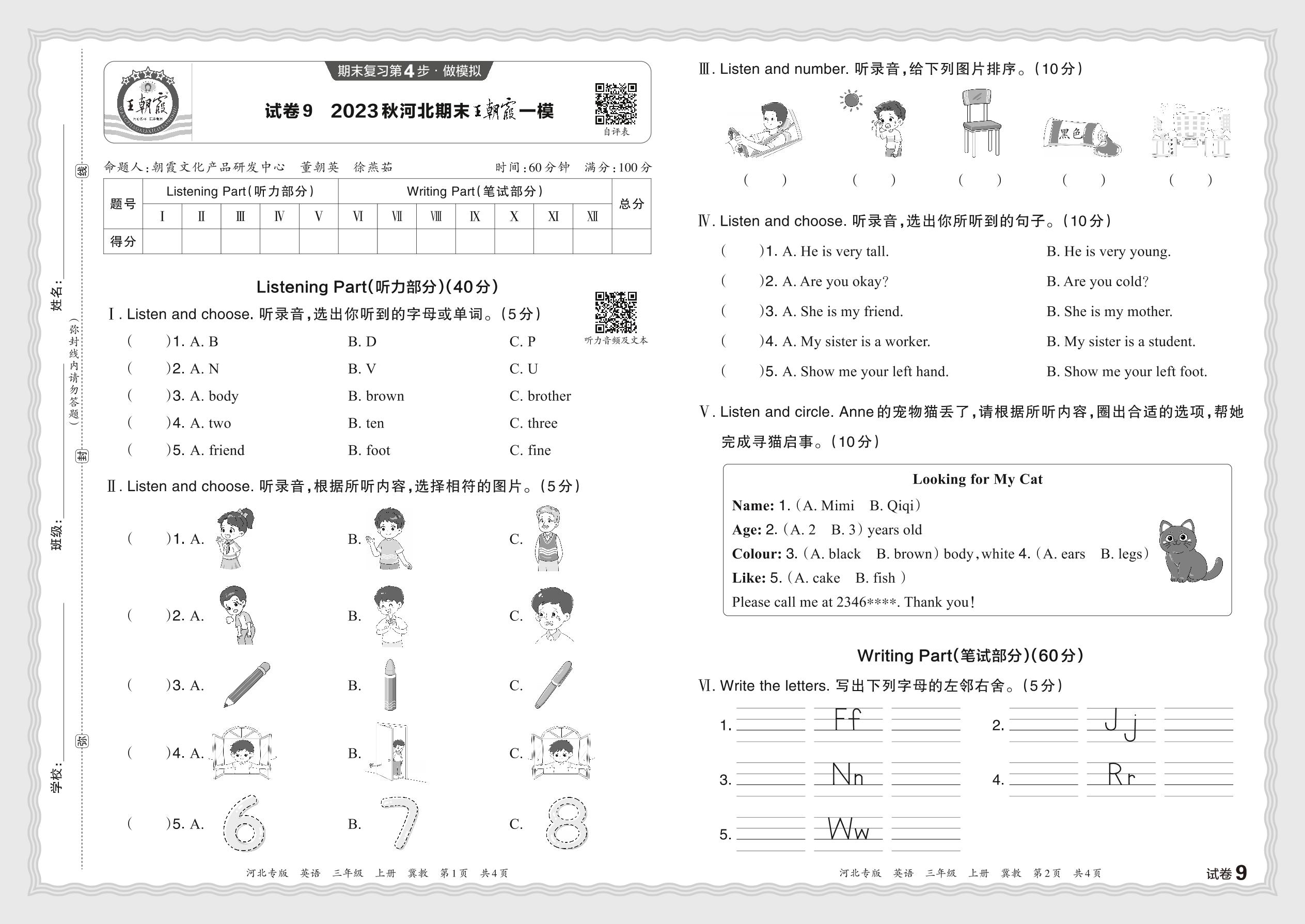 2023秋上册三年级英语冀教版 河北期末王朝霞一模