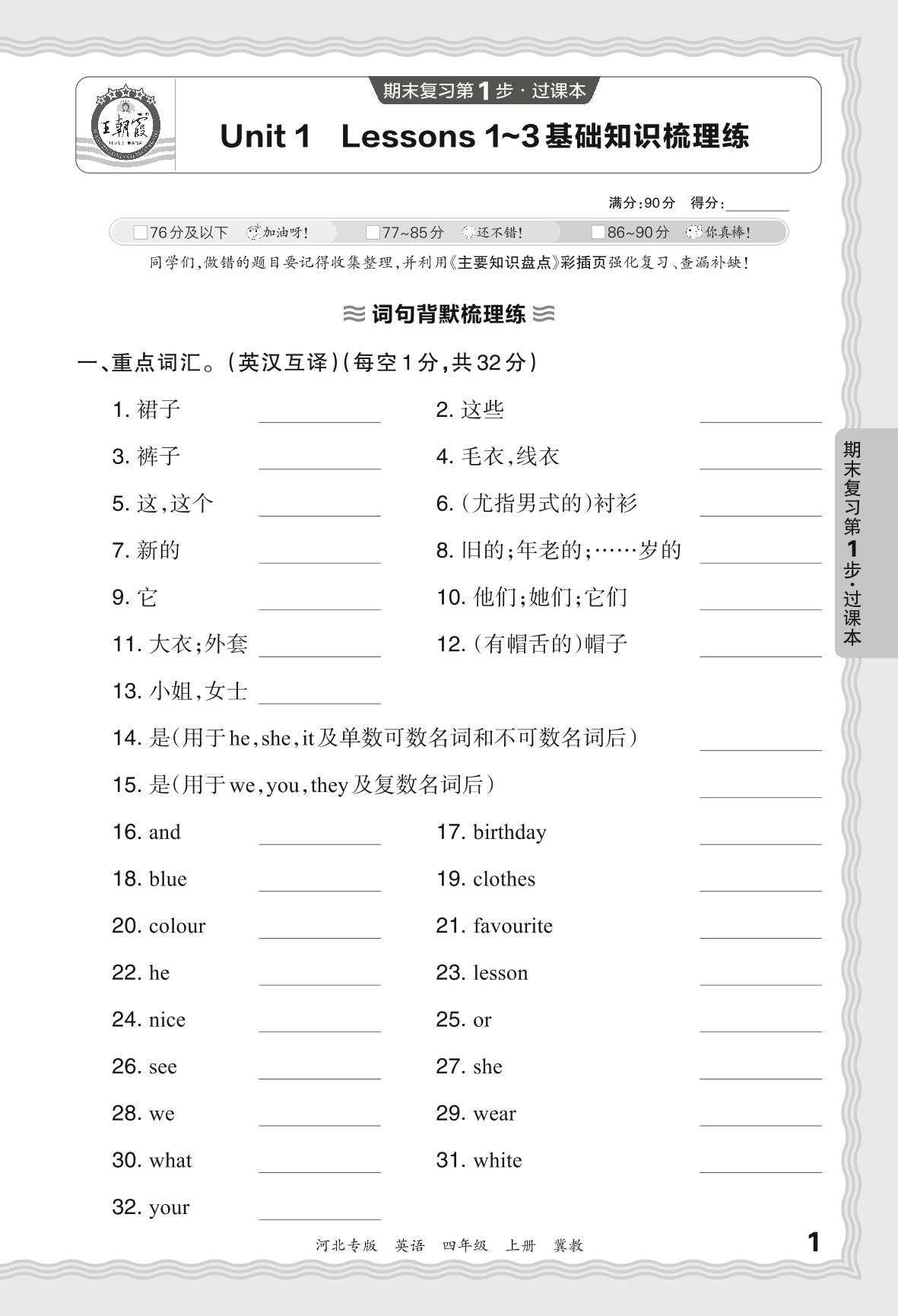 2023秋上册四年级英语冀教版 期末过课本·Unit 1 Lessons 1-3 基础知识梳理练