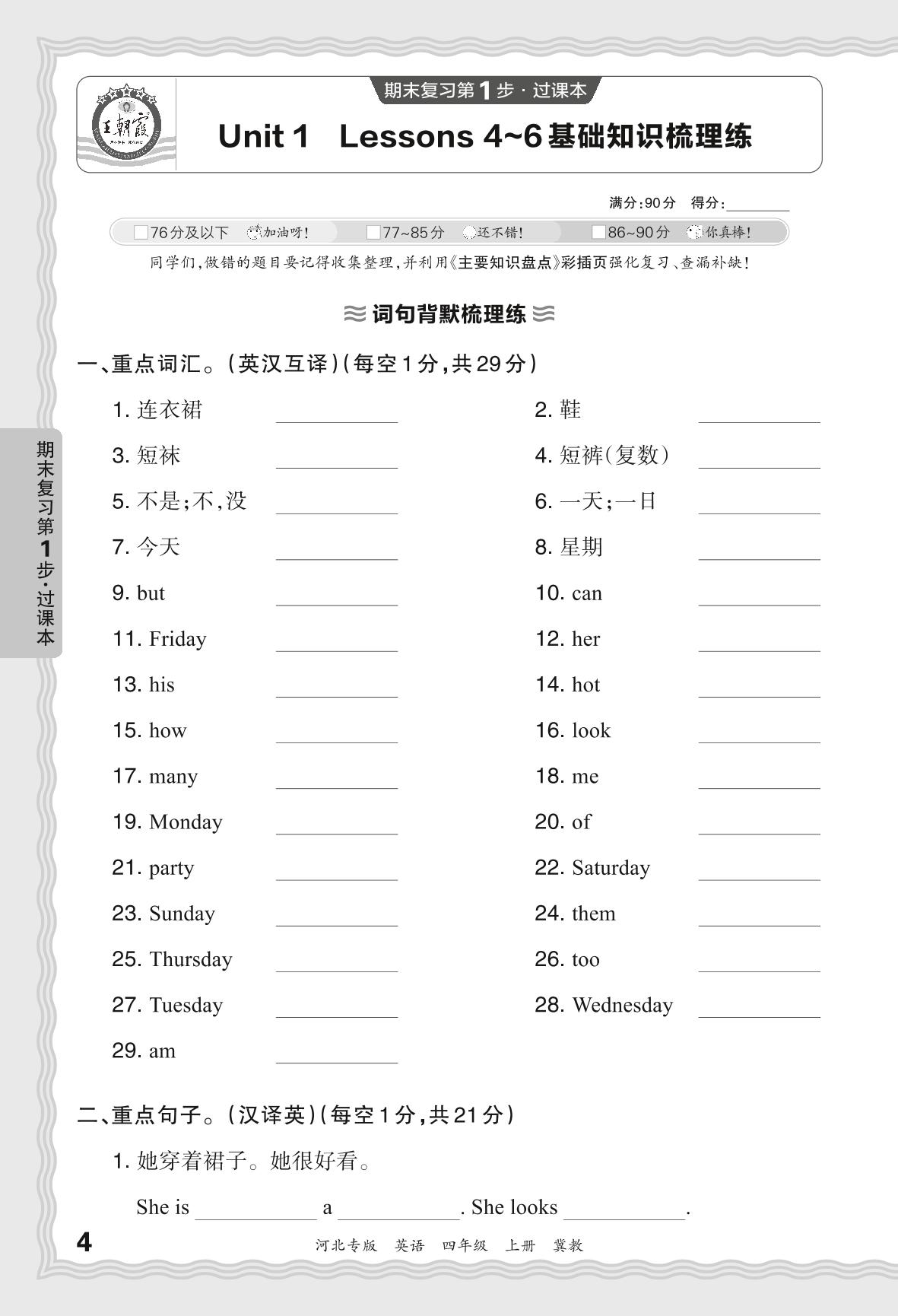 2023秋上册四年级英语冀教版 期末过课本·Unit 1 Lessons 4-6 基础知识梳理练