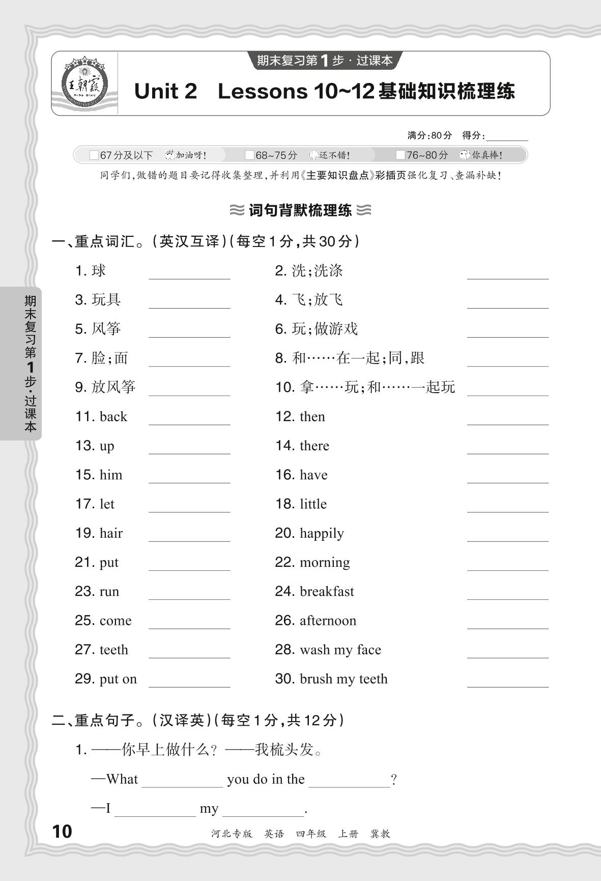 2023秋上册四年级英语冀教版 期末过课本·Unit 2 Lessons 10-12 基础知识梳理练