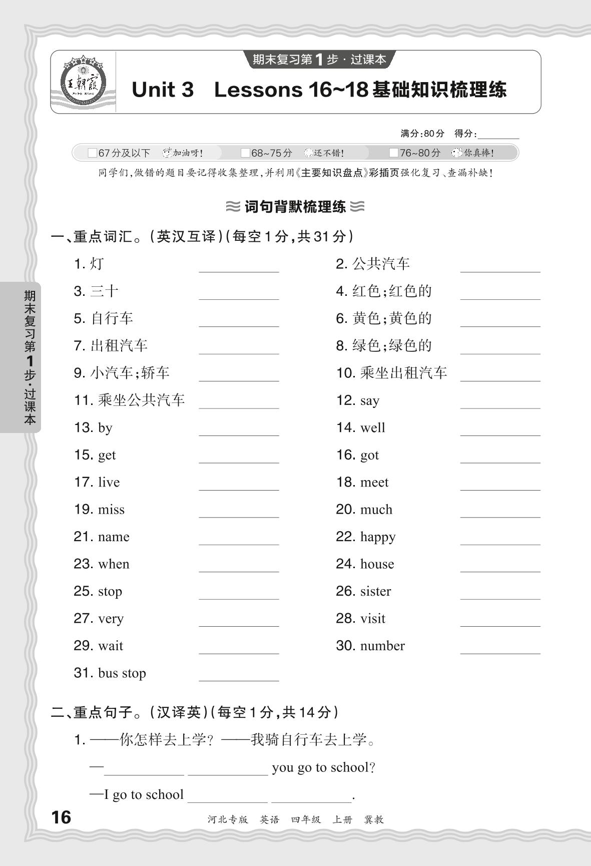 2023秋上册四年级英语冀教版 期末过课本·Unit 3 Lessons 16-18 基础知识梳理练