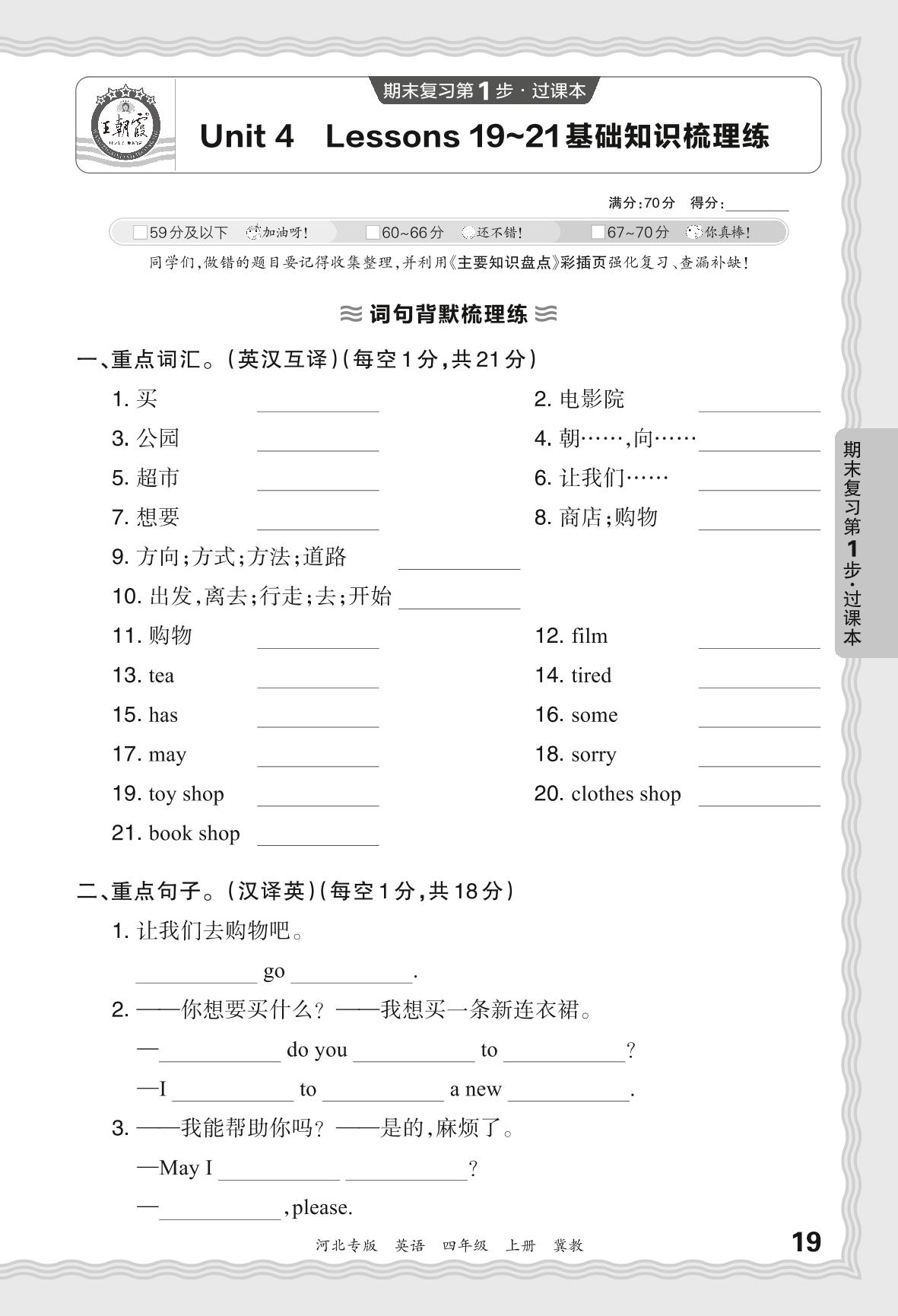 2023秋上册四年级英语冀教版 期末过课本·Unit 4 Lessons 19-21 基础知识梳理练