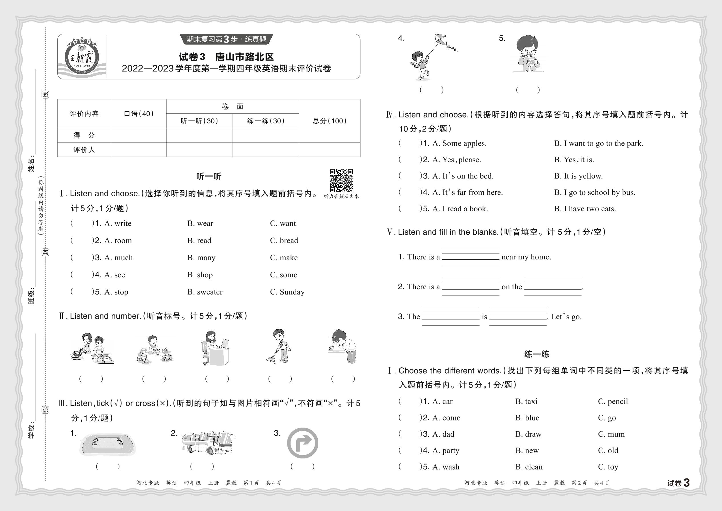 河北省唐山市路北区2022—2023学年度第一学期四年级英语期末评价试卷(冀教版)【3】